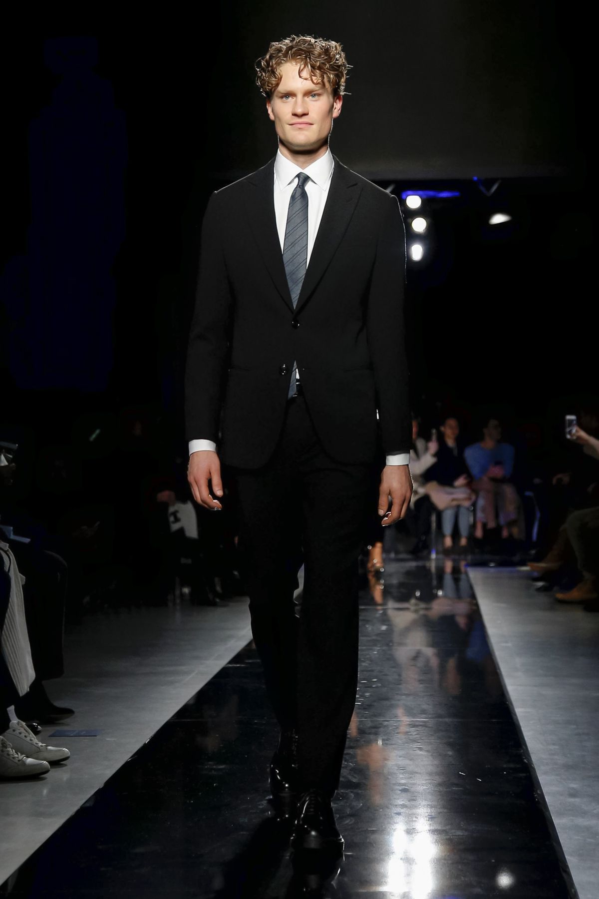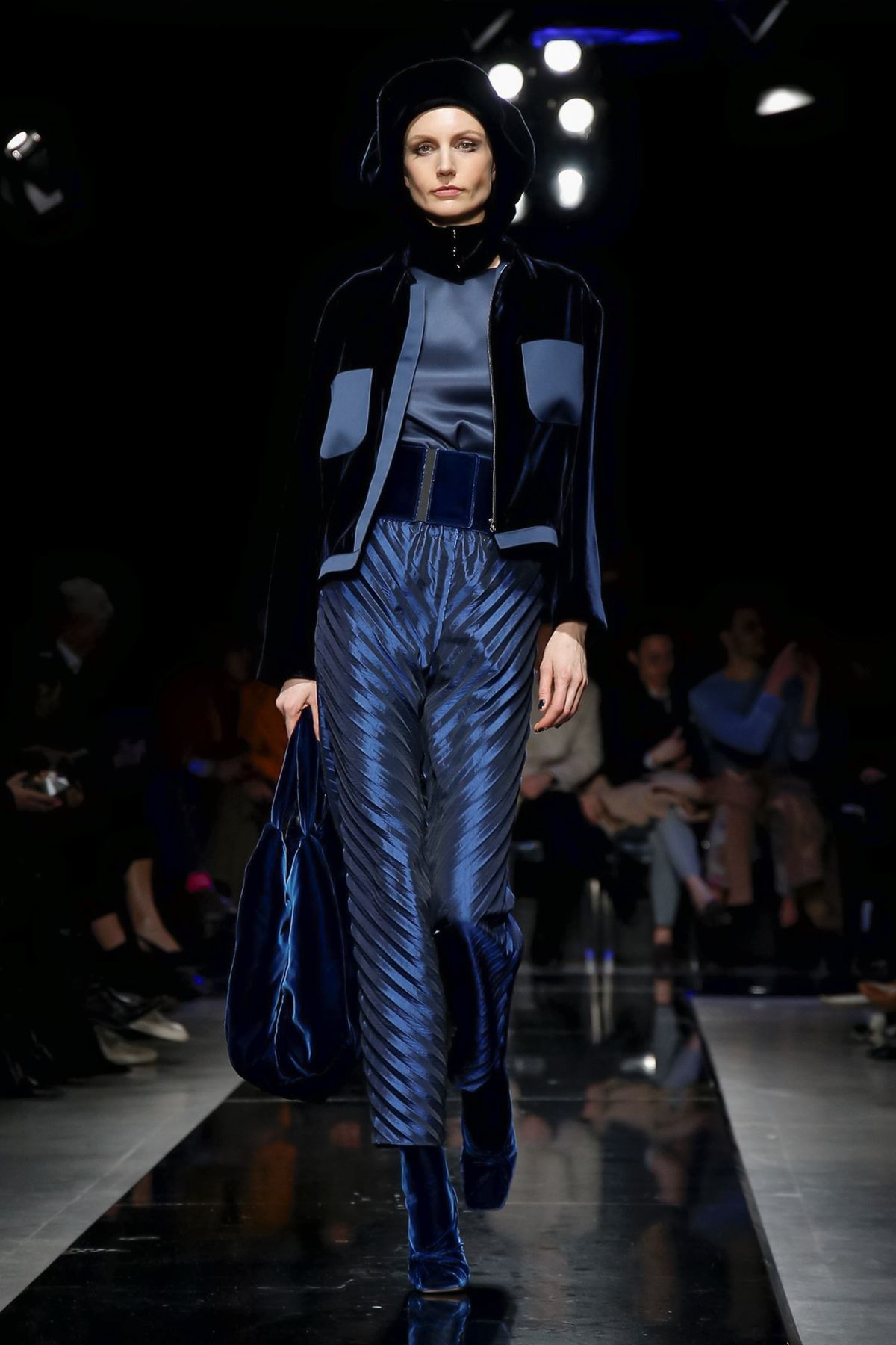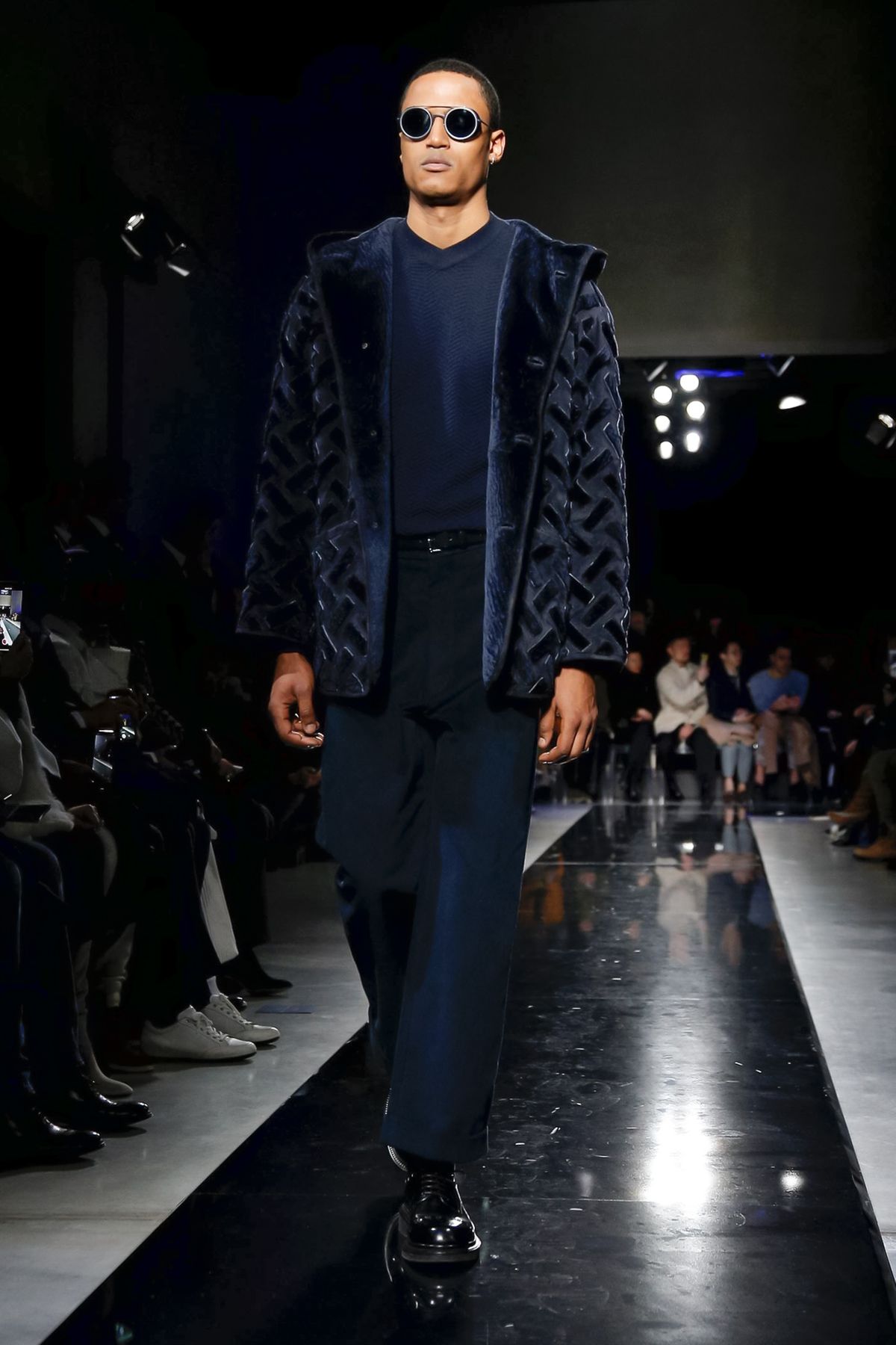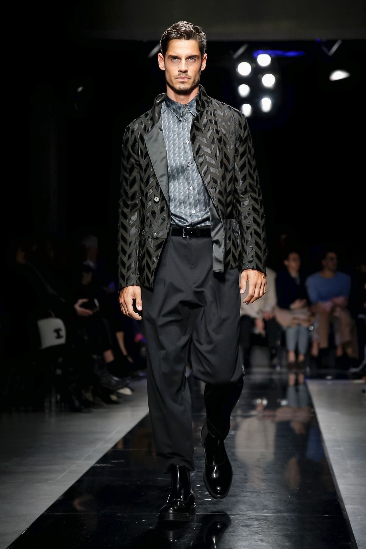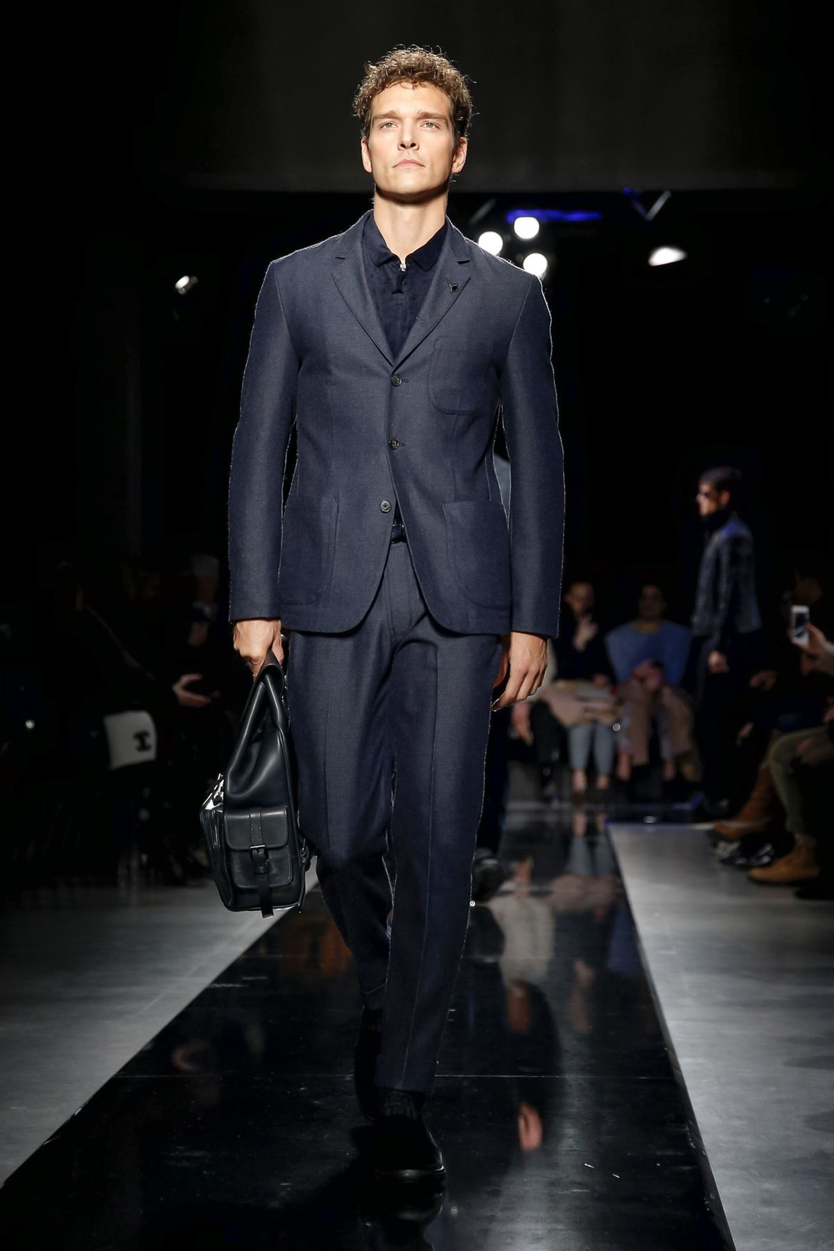 On the night before the Oscars, where Armani’s star always shines bright on the red carpet, the designer staged a cinematic work of his own in Milan: his first coed runway show at his Silos museum. It was a most elegant affair, a “Rhapsody in Blue” as he called it after the Gershwin song, in an intimate, couture-like setting that amplified the house’s signature refrain of fluid tailoring with some jazzy new flourishes.