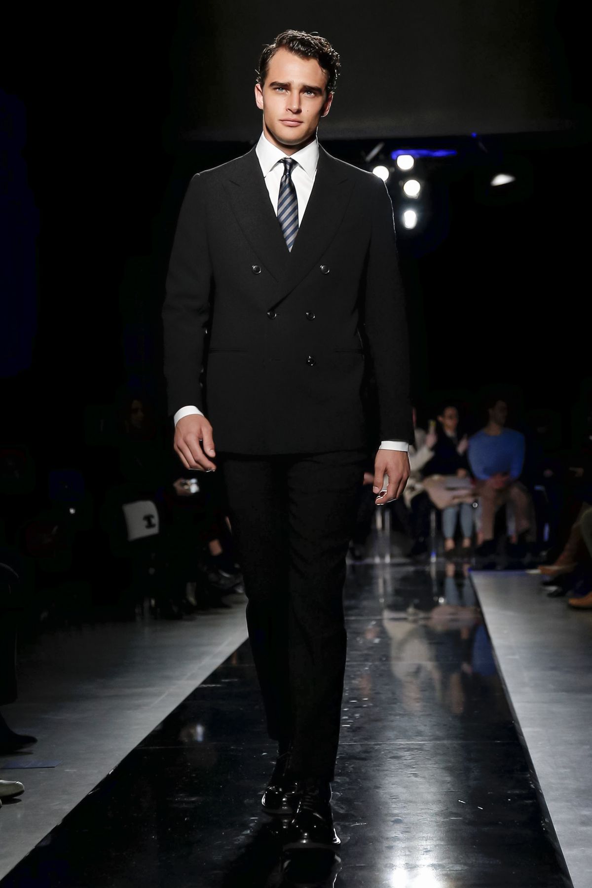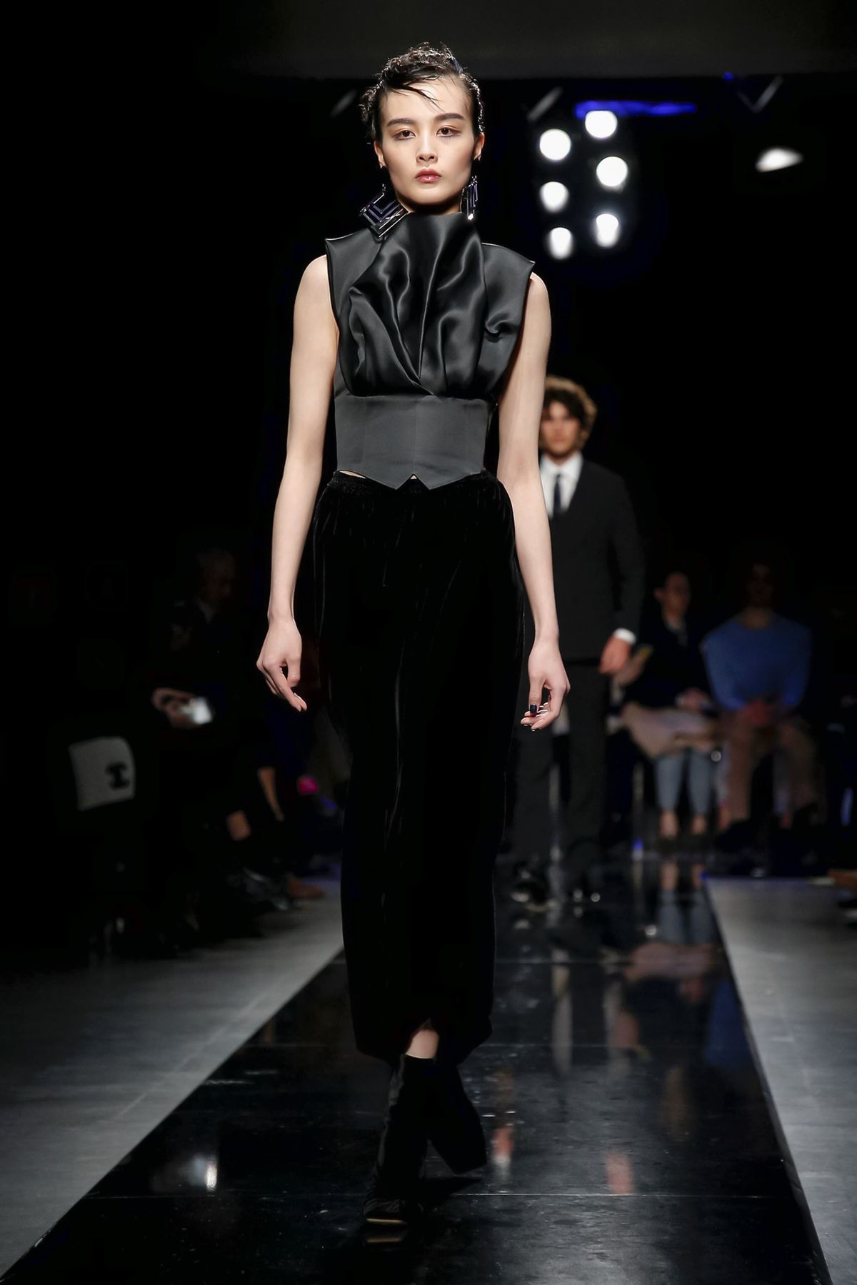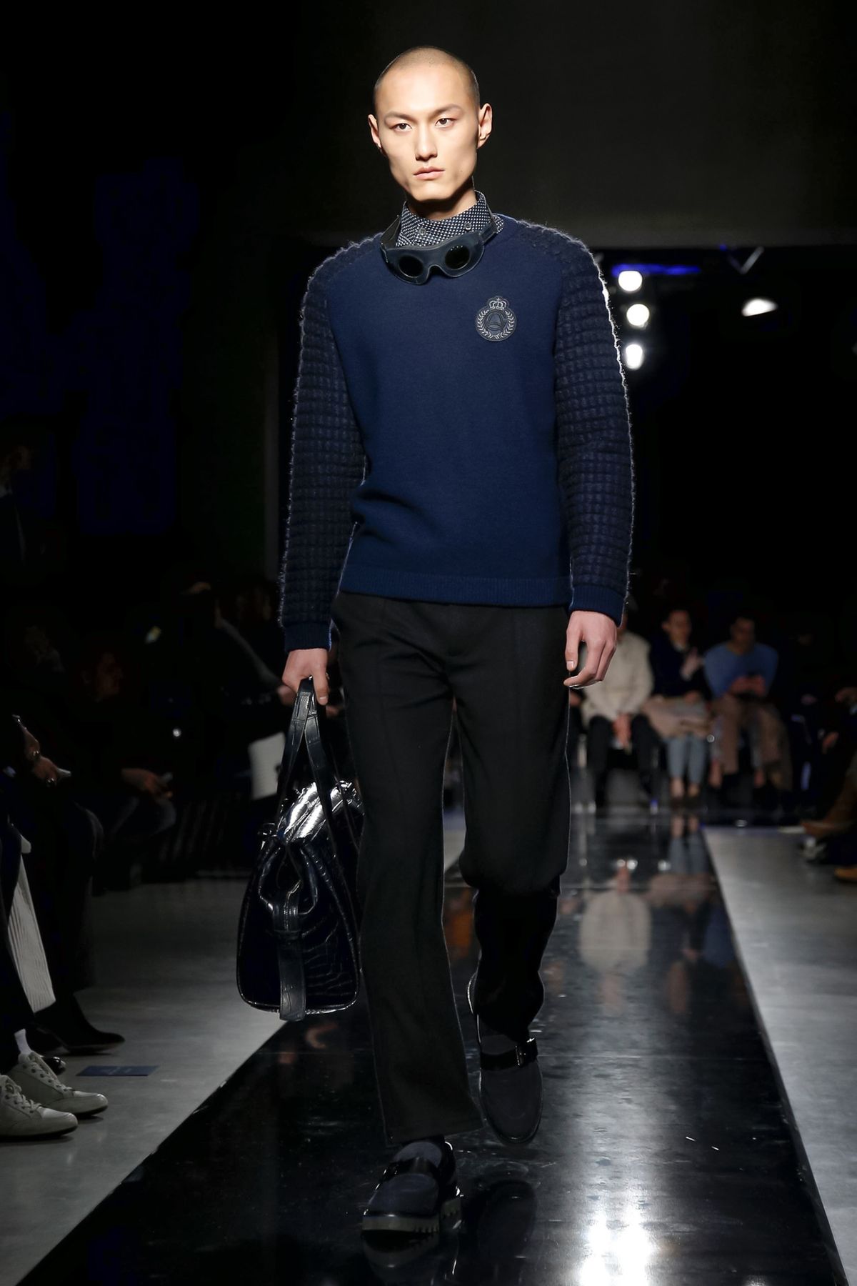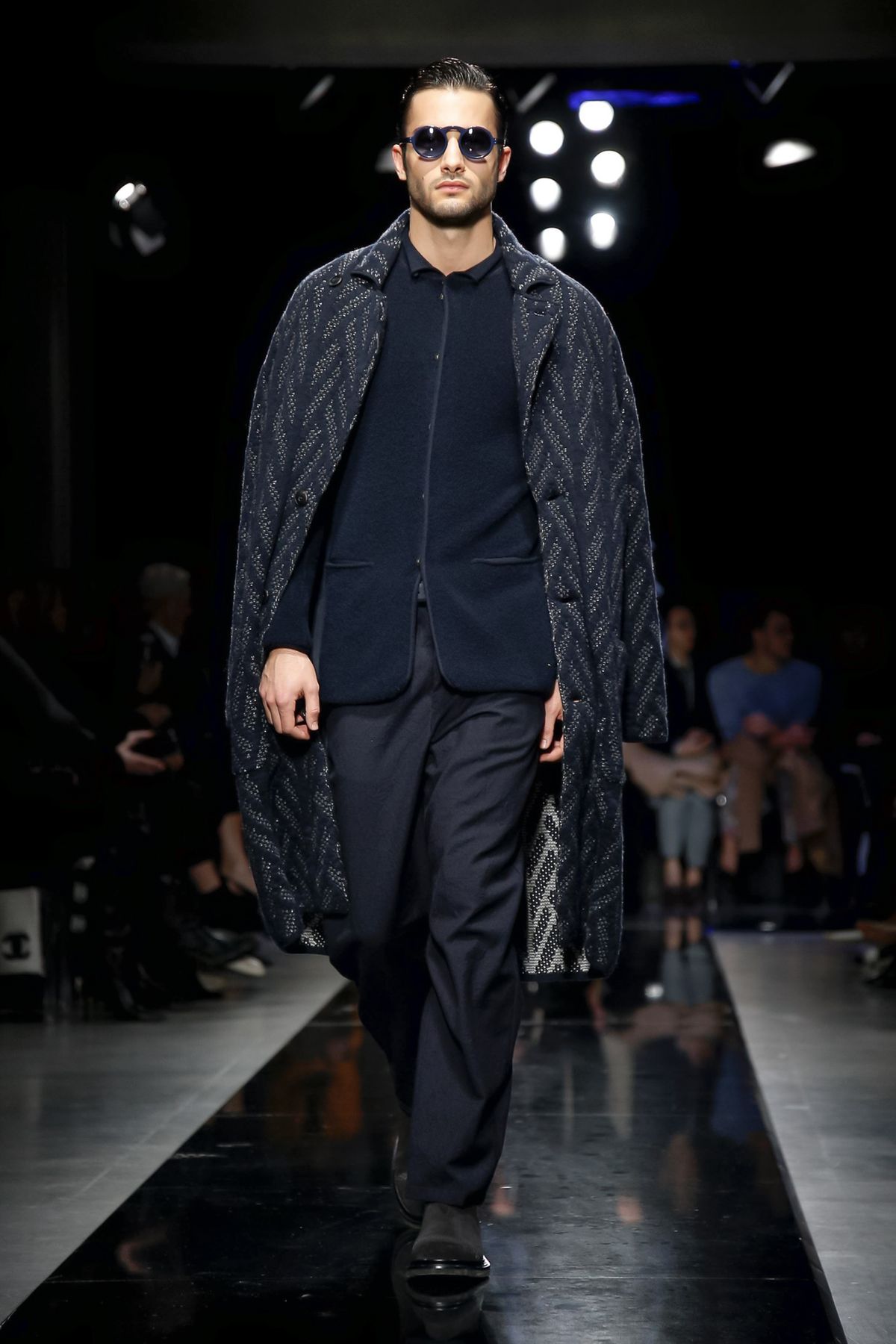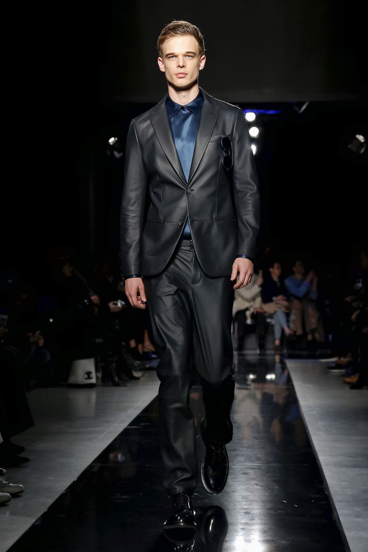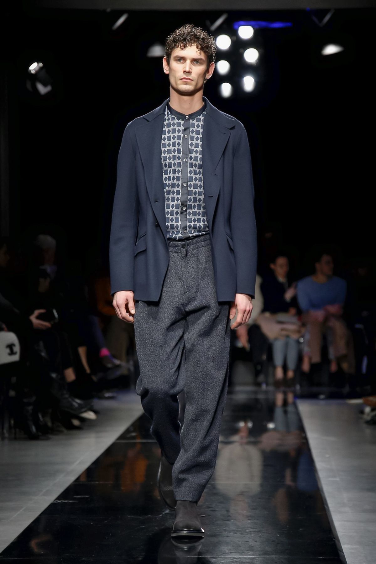 On the night before the Oscars, where Armani’s star always shines bright on the red carpet, the designer staged a cinematic work of his own in Milan: his first coed runway show at his Silos museum. It was a most elegant affair, a “Rhapsody in Blue” as he called it after the Gershwin song, in an intimate, couture-like setting that amplified the house’s signature refrain of fluid tailoring with some jazzy new flourishes.