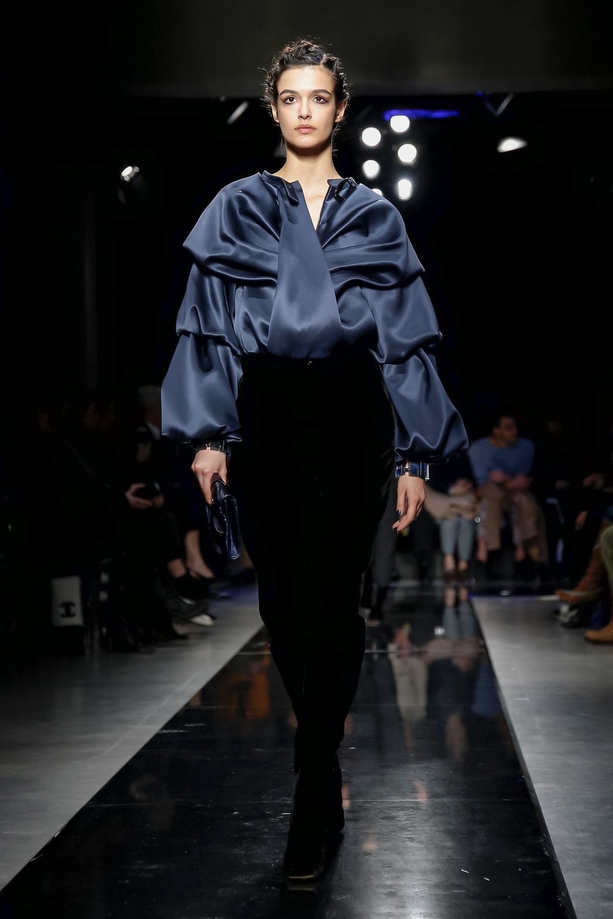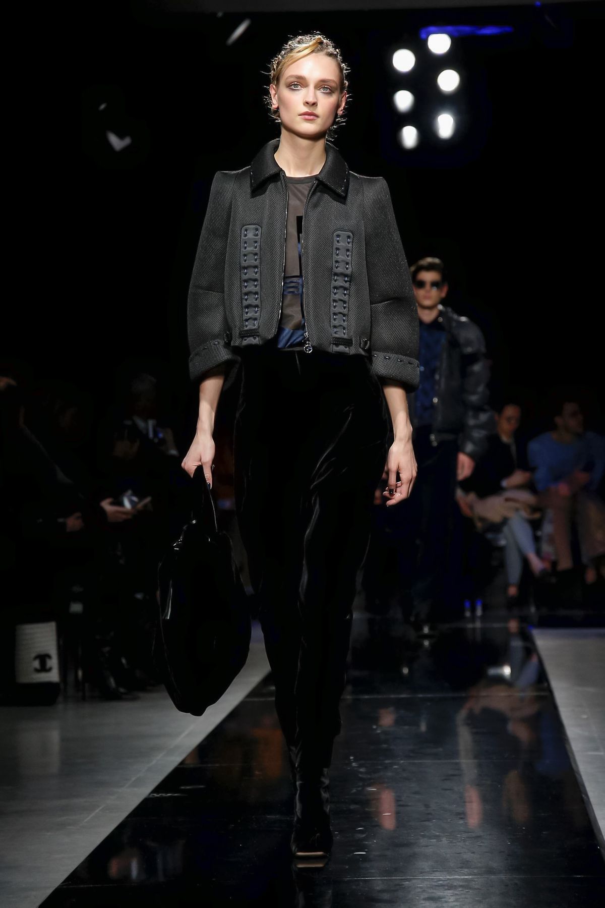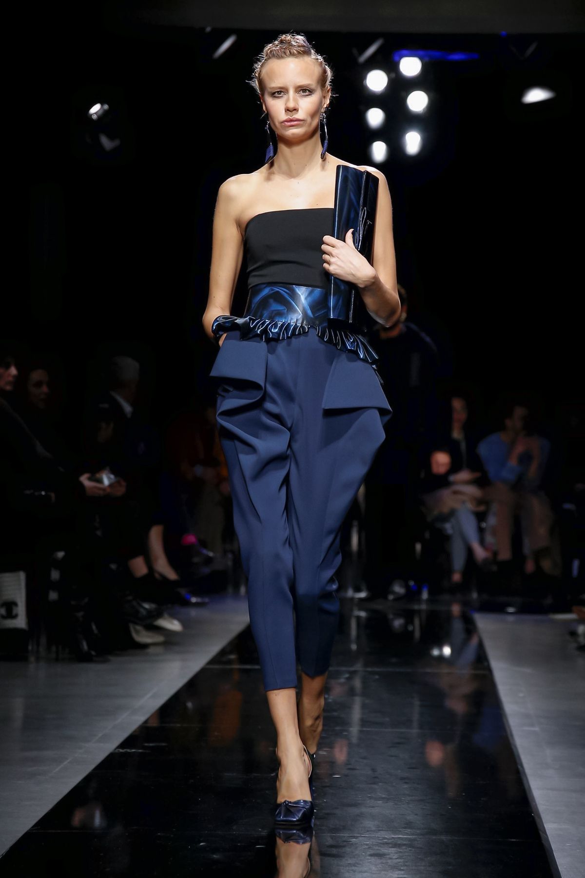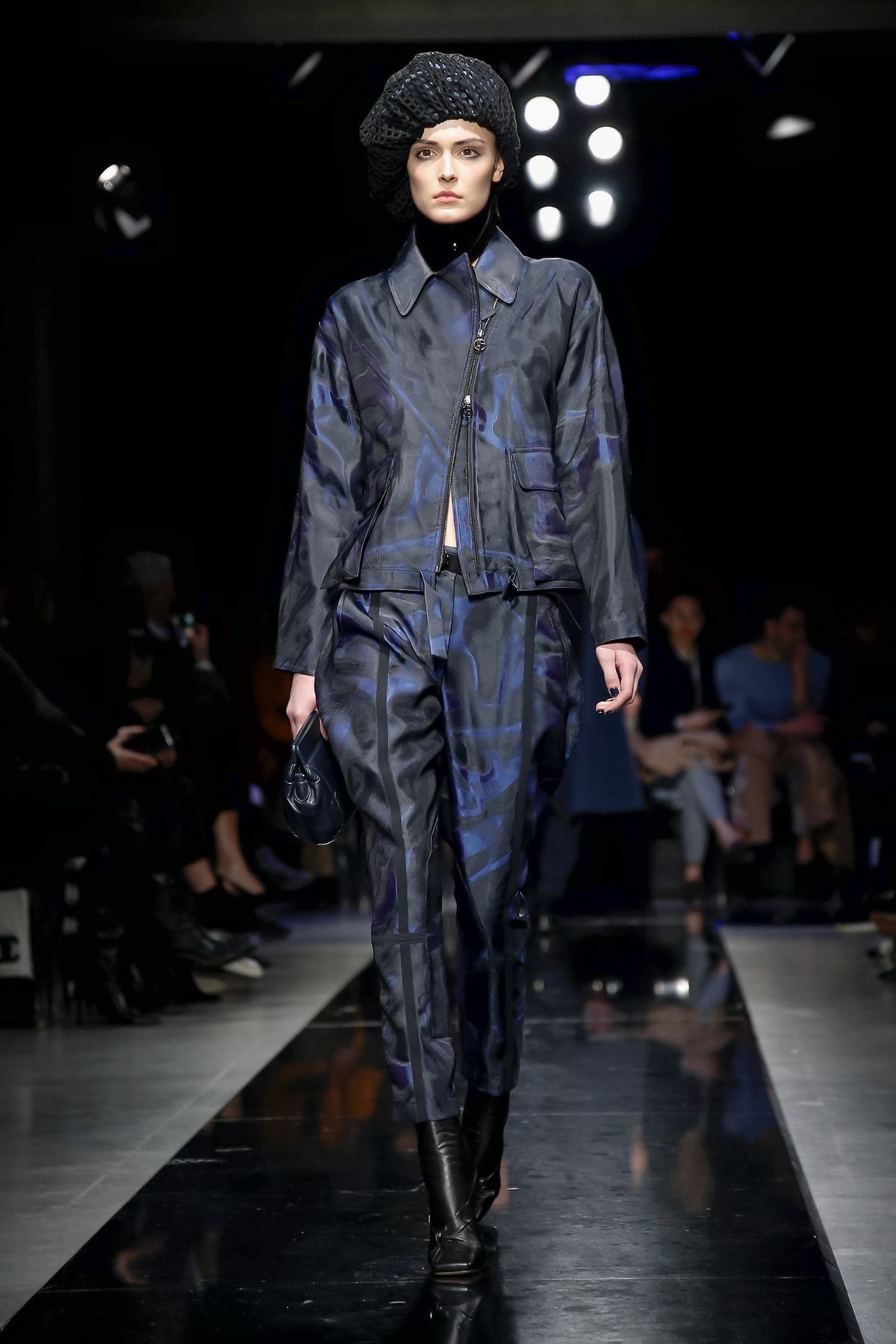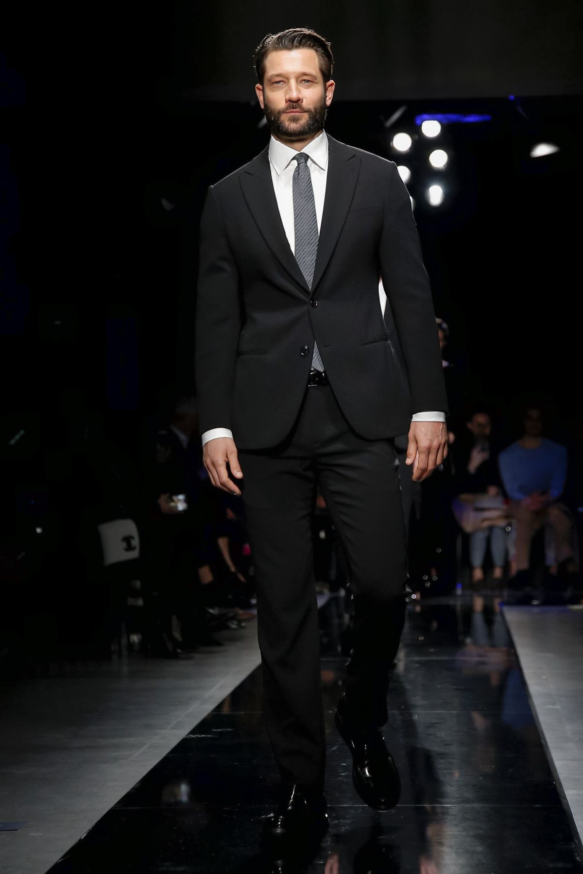 On the night before the Oscars, where Armani’s star always shines bright on the red carpet, the designer staged a cinematic work of his own in Milan: his first coed runway show at his Silos museum. It was a most elegant affair, a “Rhapsody in Blue” as he called it after the Gershwin song, in an intimate, couture-like setting that amplified the house’s signature refrain of fluid tailoring with some jazzy new flourishes.