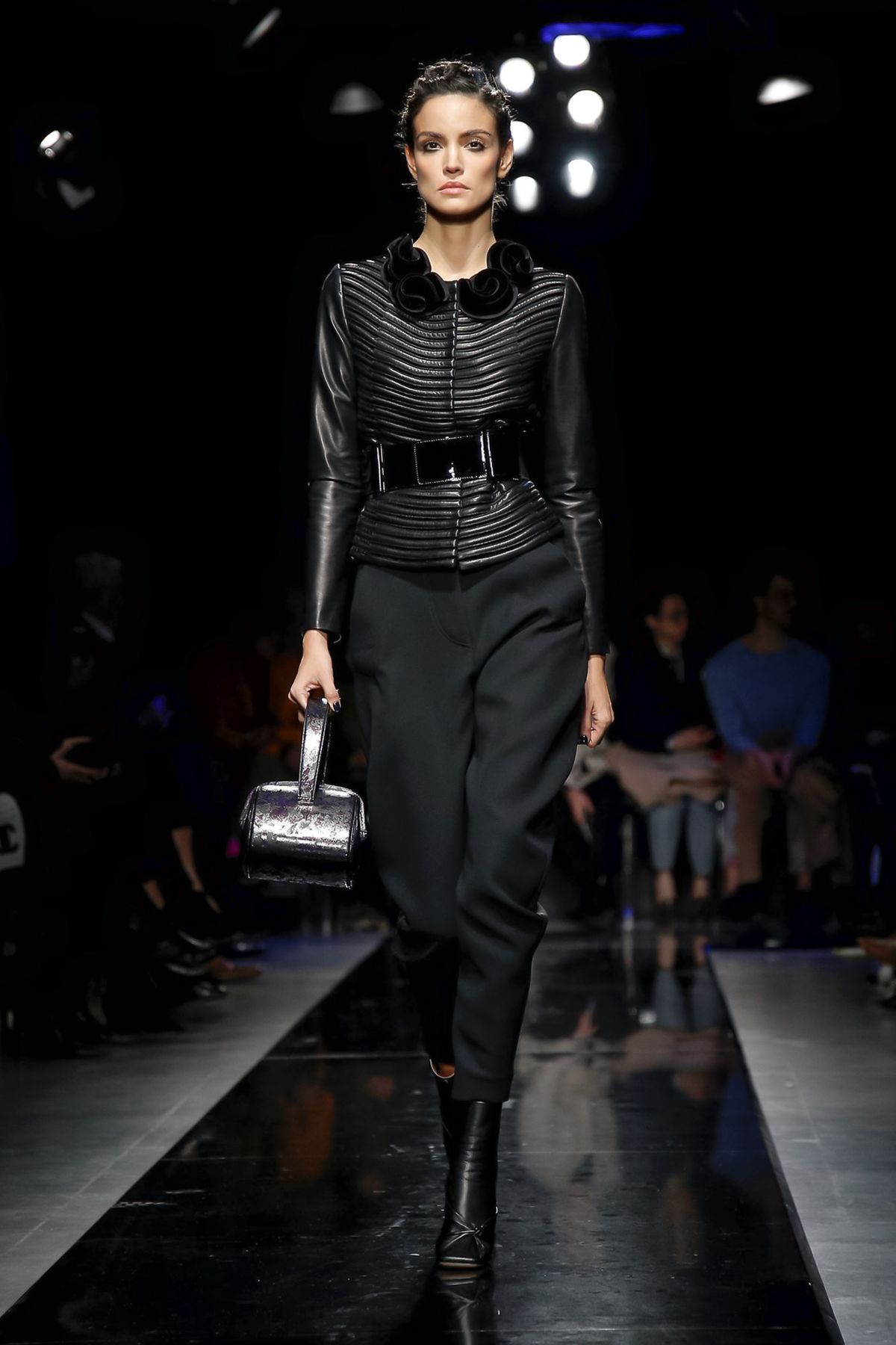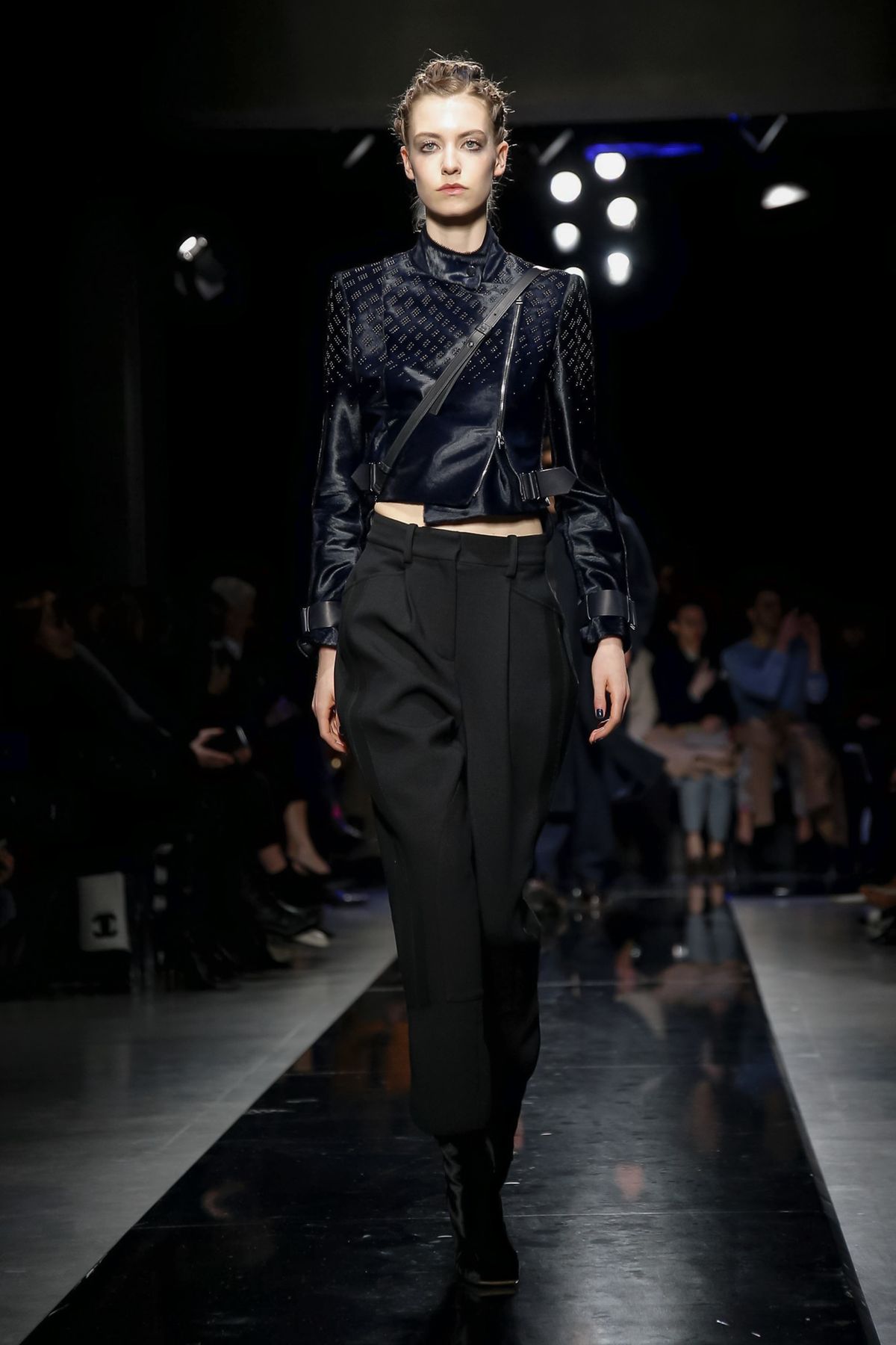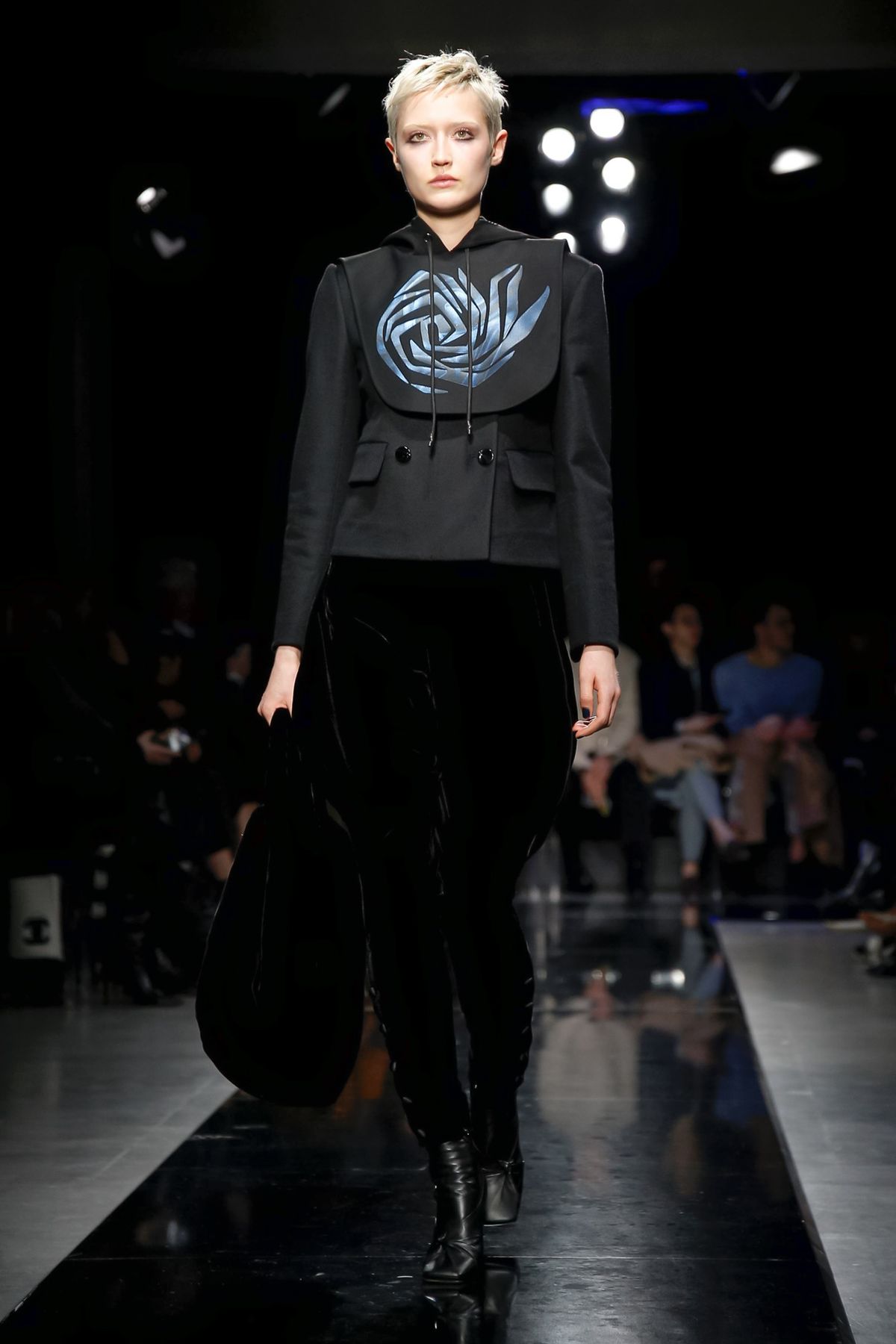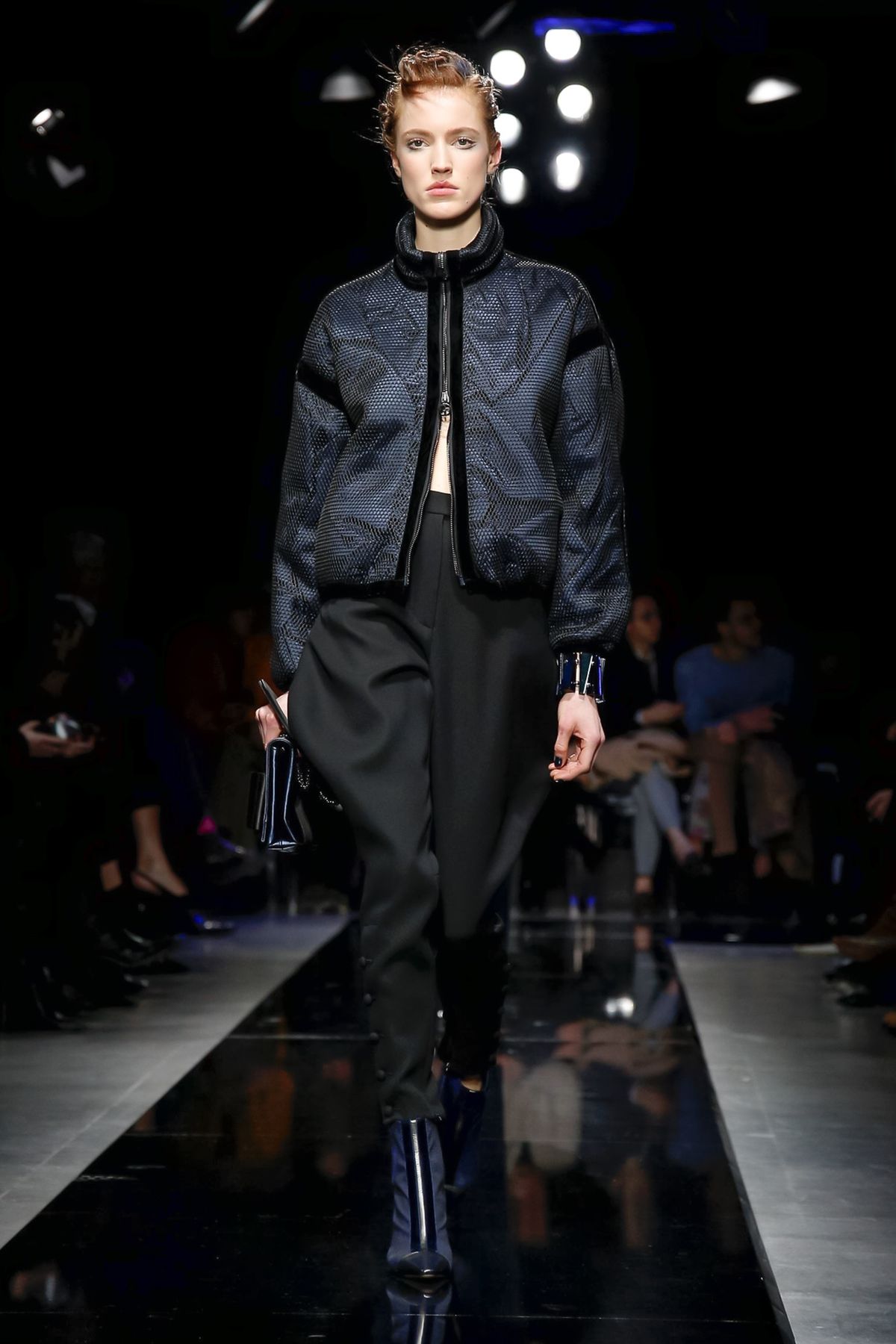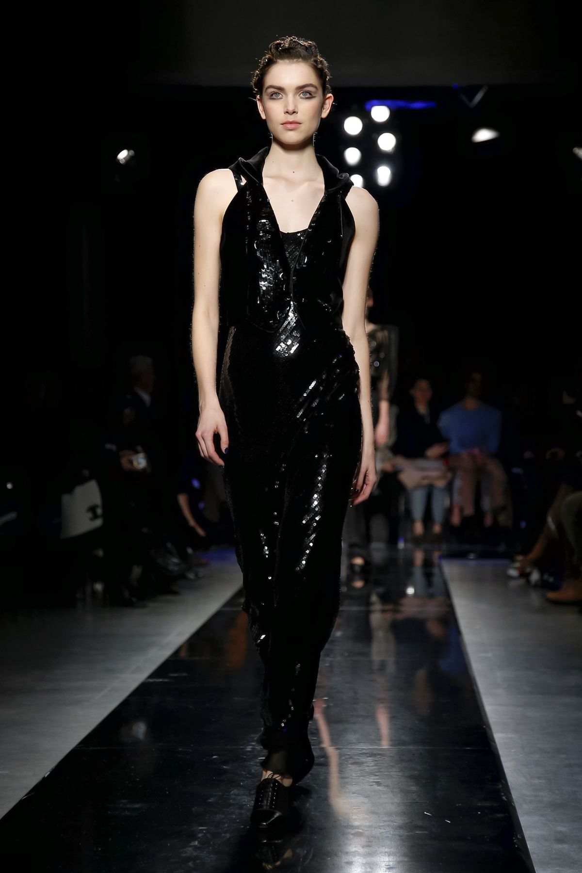 On the night before the Oscars, where Armani’s star always shines bright on the red carpet, the designer staged a cinematic work of his own in Milan: his first coed runway show at his Silos museum. It was a most elegant affair, a “Rhapsody in Blue” as he called it after the Gershwin song, in an intimate, couture-like setting that amplified the house’s signature refrain of fluid tailoring with some jazzy new flourishes.