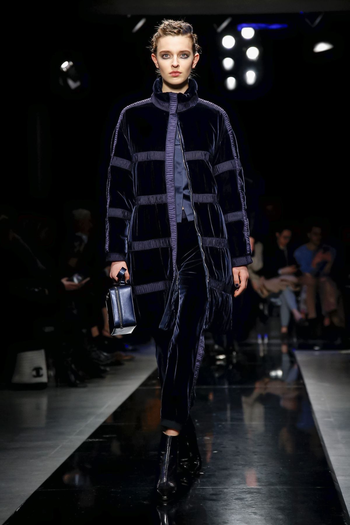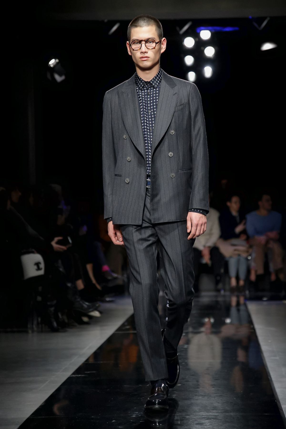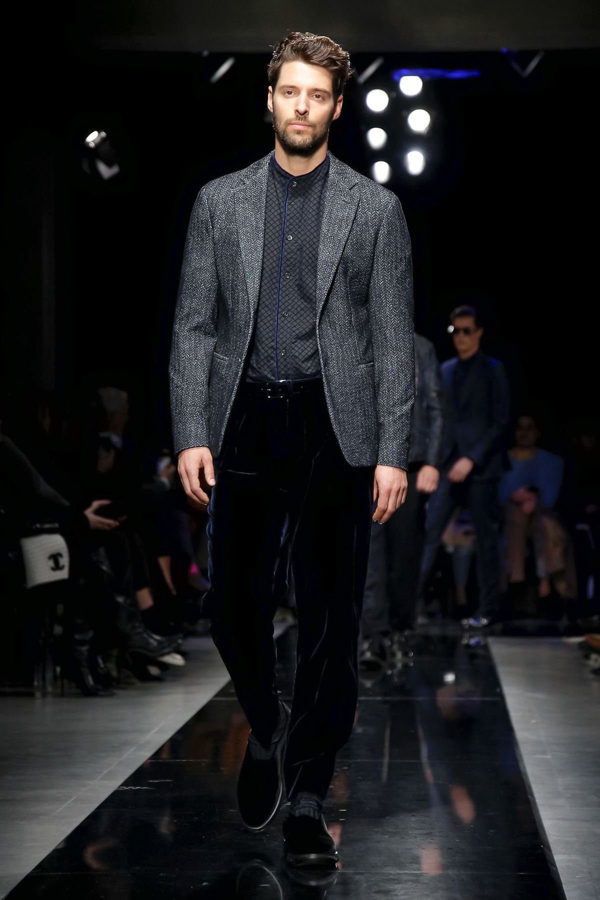 Men’s looks had an even wider range, from an uber luxe Armani take on a weekend warrior’s fleece worn under a graphic gray-and-blue patterned overcoat, to a matinee idol’s shadow blue plaid velvet suit with black piping that had the softness and ease of pajamas. Several classic gray suits, one in windowpane check, were sculpted to models’ muscled perfection, while boxy, double-breasted checked jackets with shorter pants, worn with subtle printed shirts and brainy horn-rim glasses were tailored to the creative class.