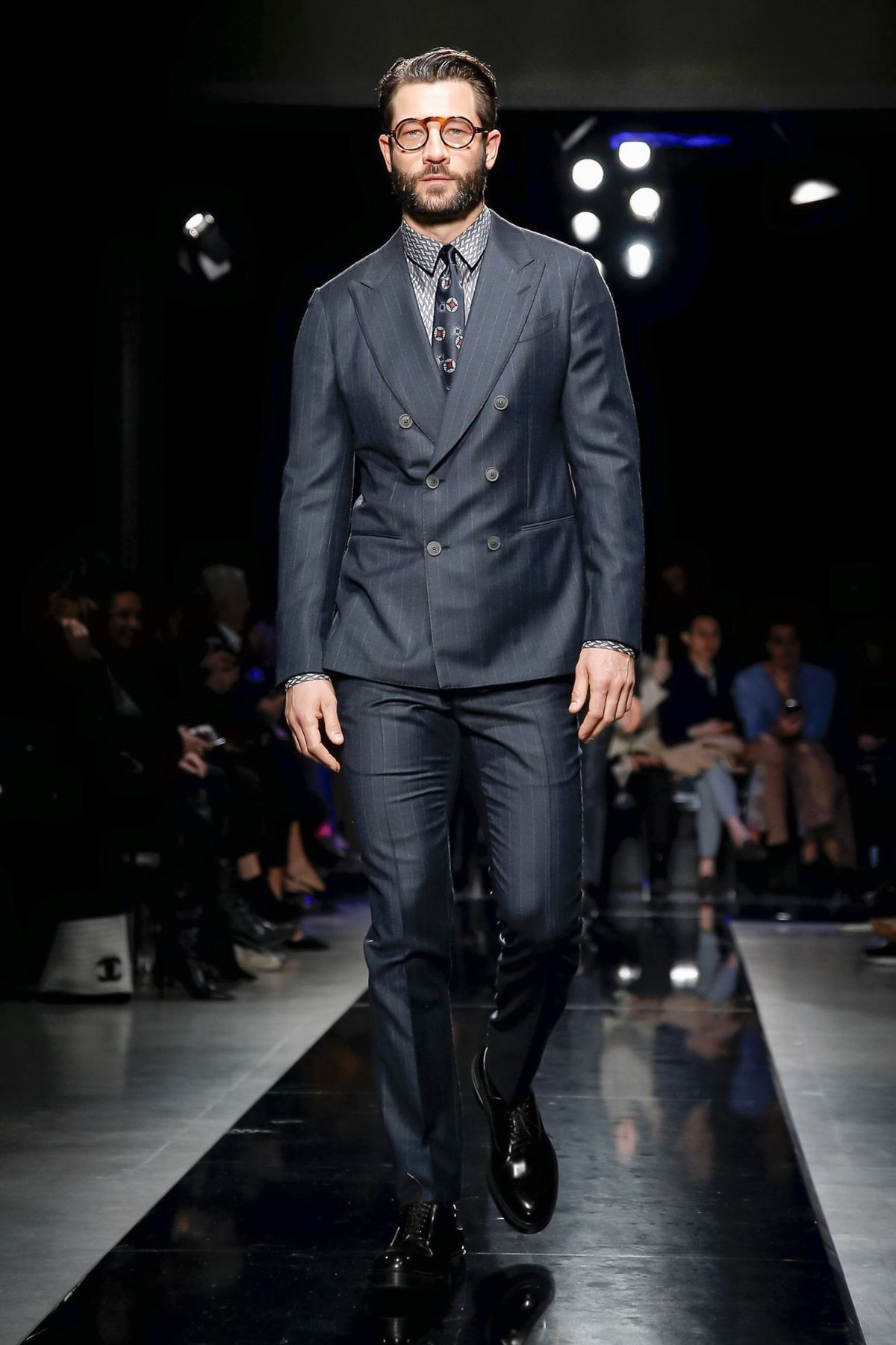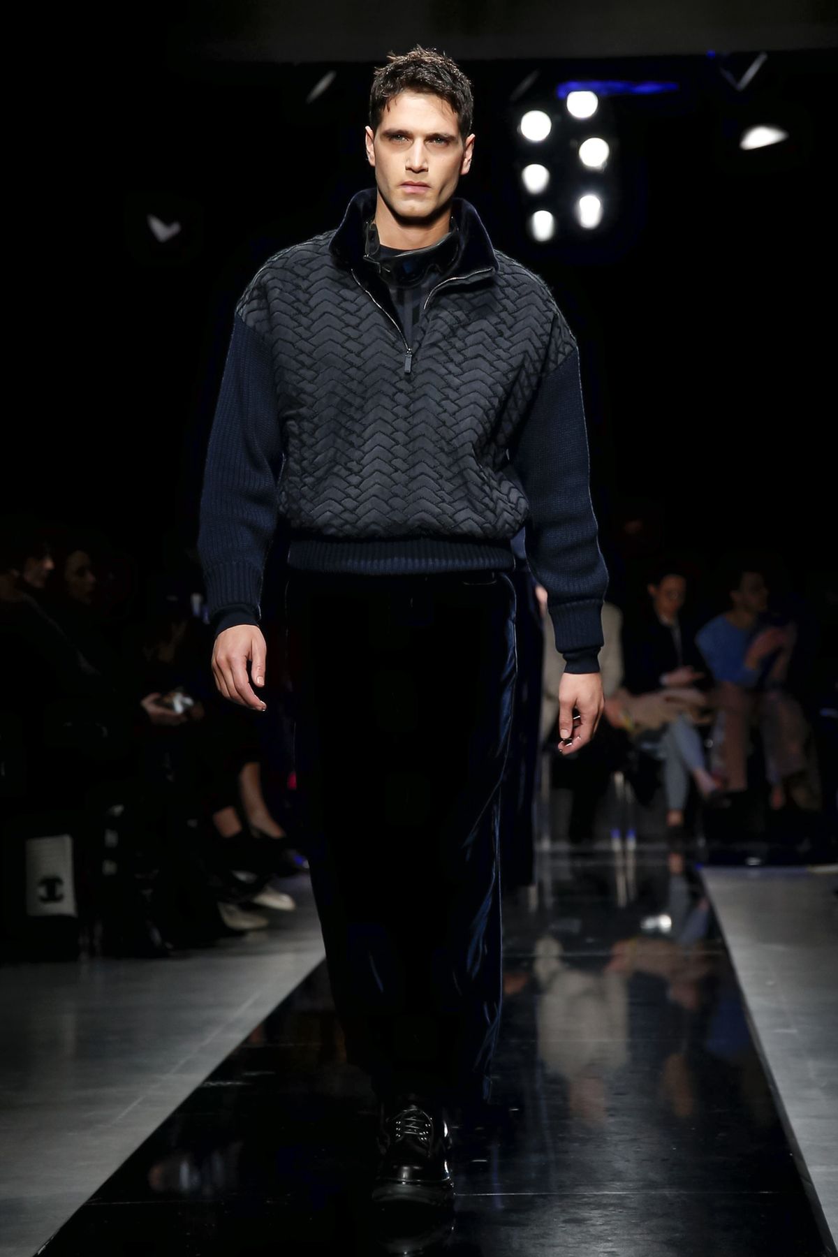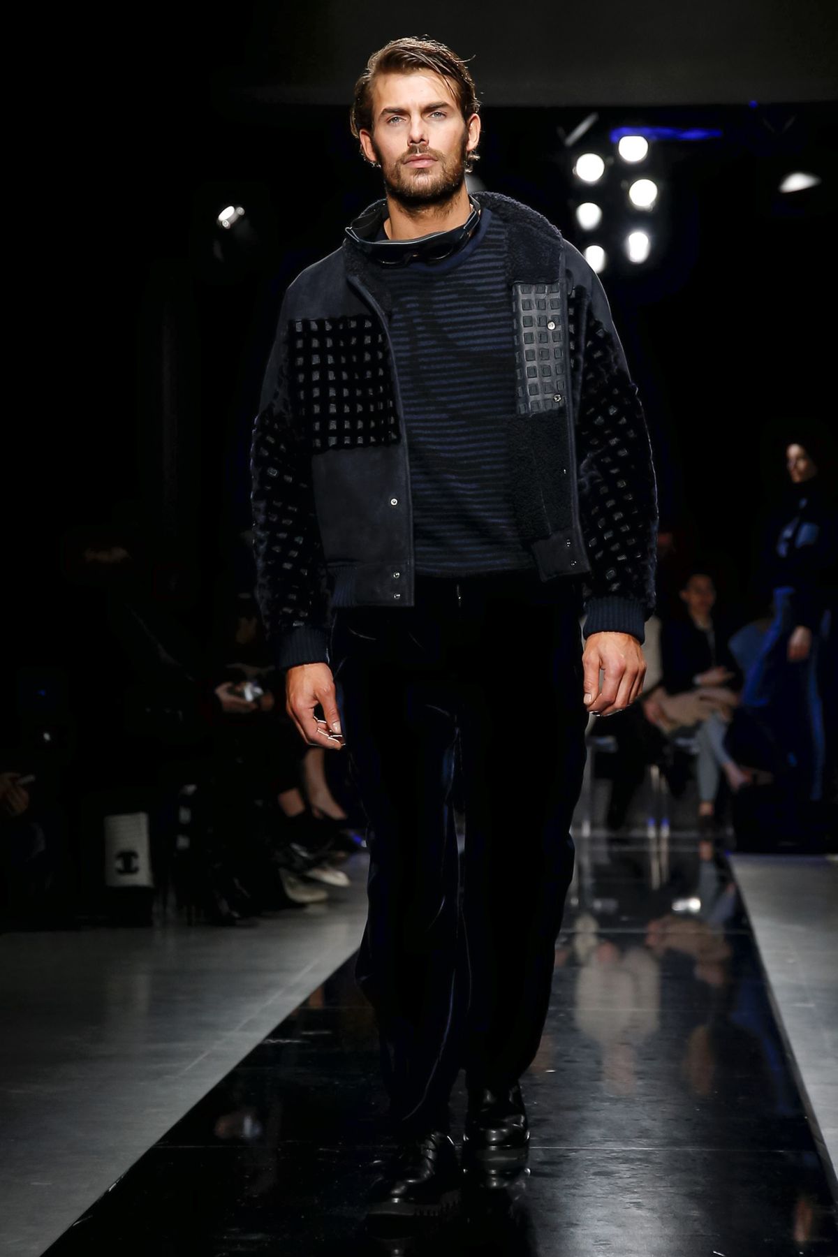 Men’s looks had an even wider range, from an uber luxe Armani take on a weekend warrior’s fleece worn under a graphic gray-and-blue patterned overcoat, to a matinee idol’s shadow blue plaid velvet suit with black piping that had the softness and ease of pajamas. Several classic gray suits, one in windowpane check, were sculpted to models’ muscled perfection, while boxy, double-breasted checked jackets with shorter pants, worn with subtle printed shirts and brainy horn-rim glasses were tailored to the creative class.