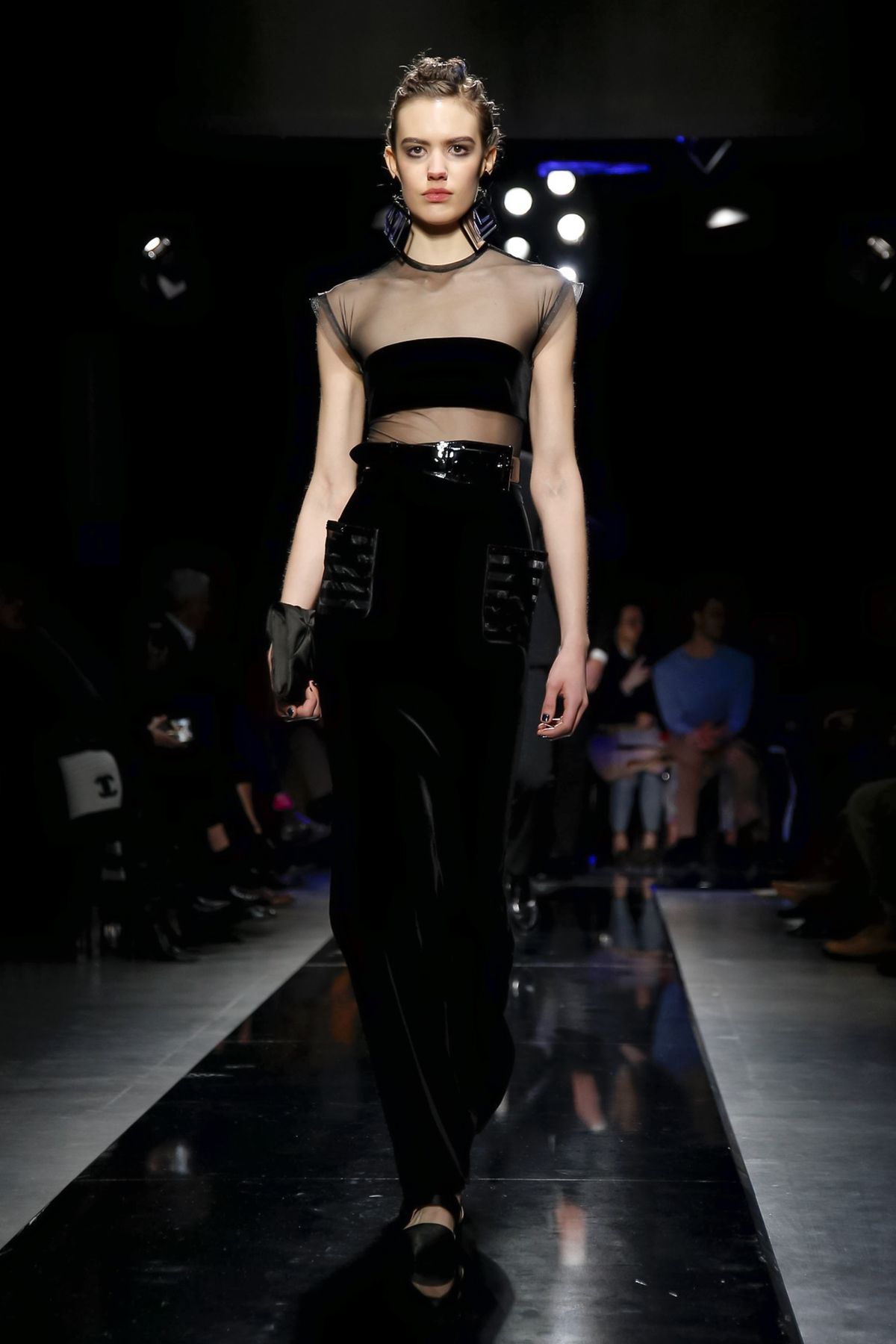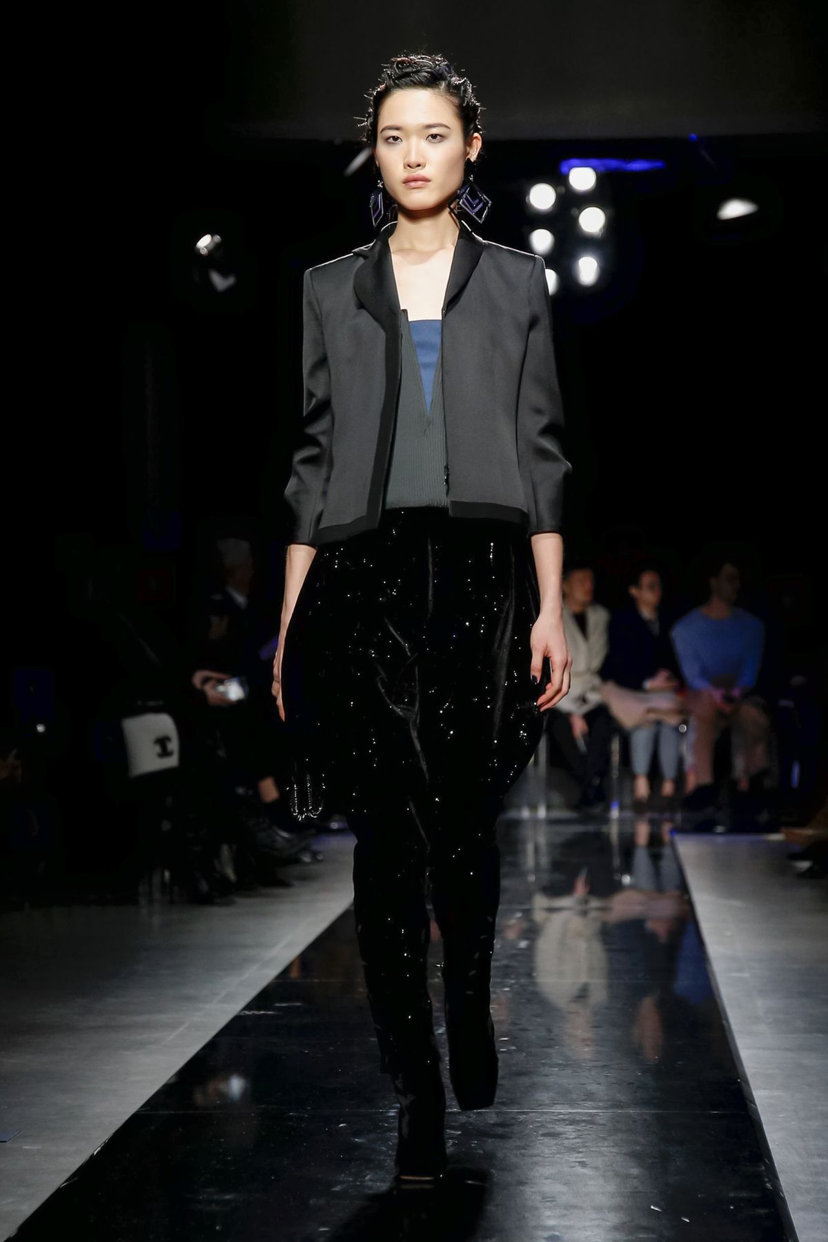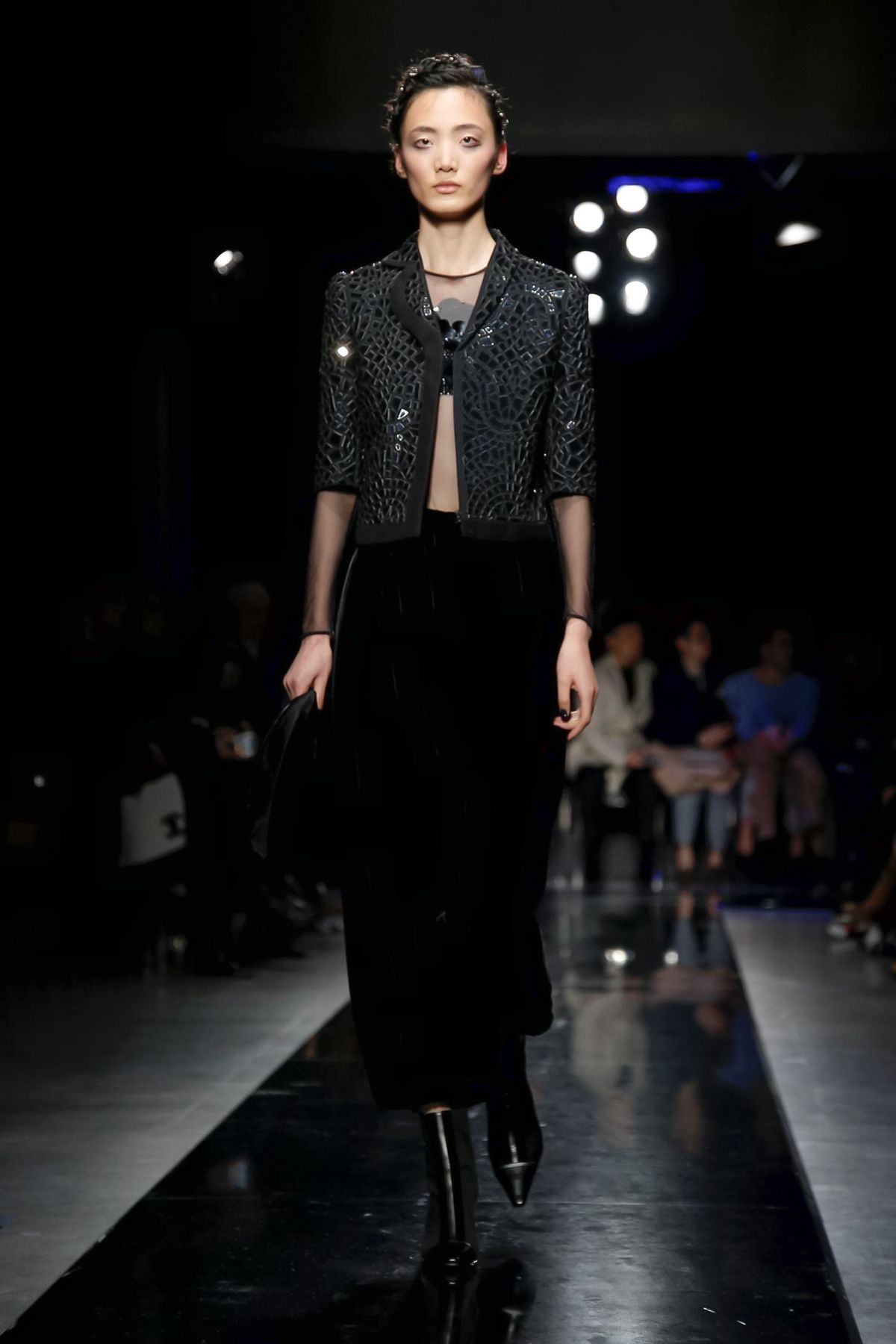 Later, the designer’s gestures became even more grand. A single-sleeve glittery, sheer squiggle-embroidered top with a blue flower bloom at the structured shoulder, worn over jodphurs; and a stunning jet tile-embroidered, cap-sleeve bustier over velvet pants were the eveningwear crescendos before the final gowns, as stick-thin as musical notes, with playful sheer bodices, disc and tile embroideries.