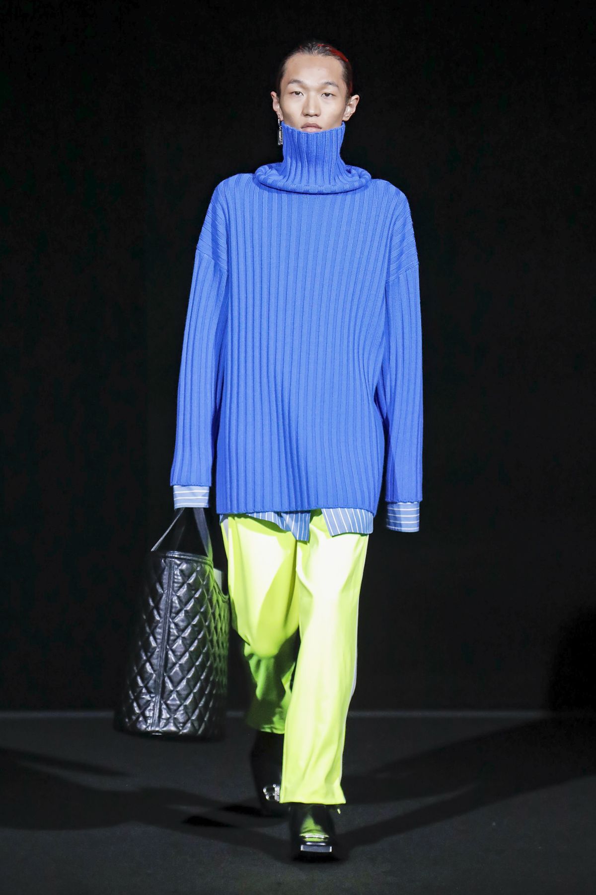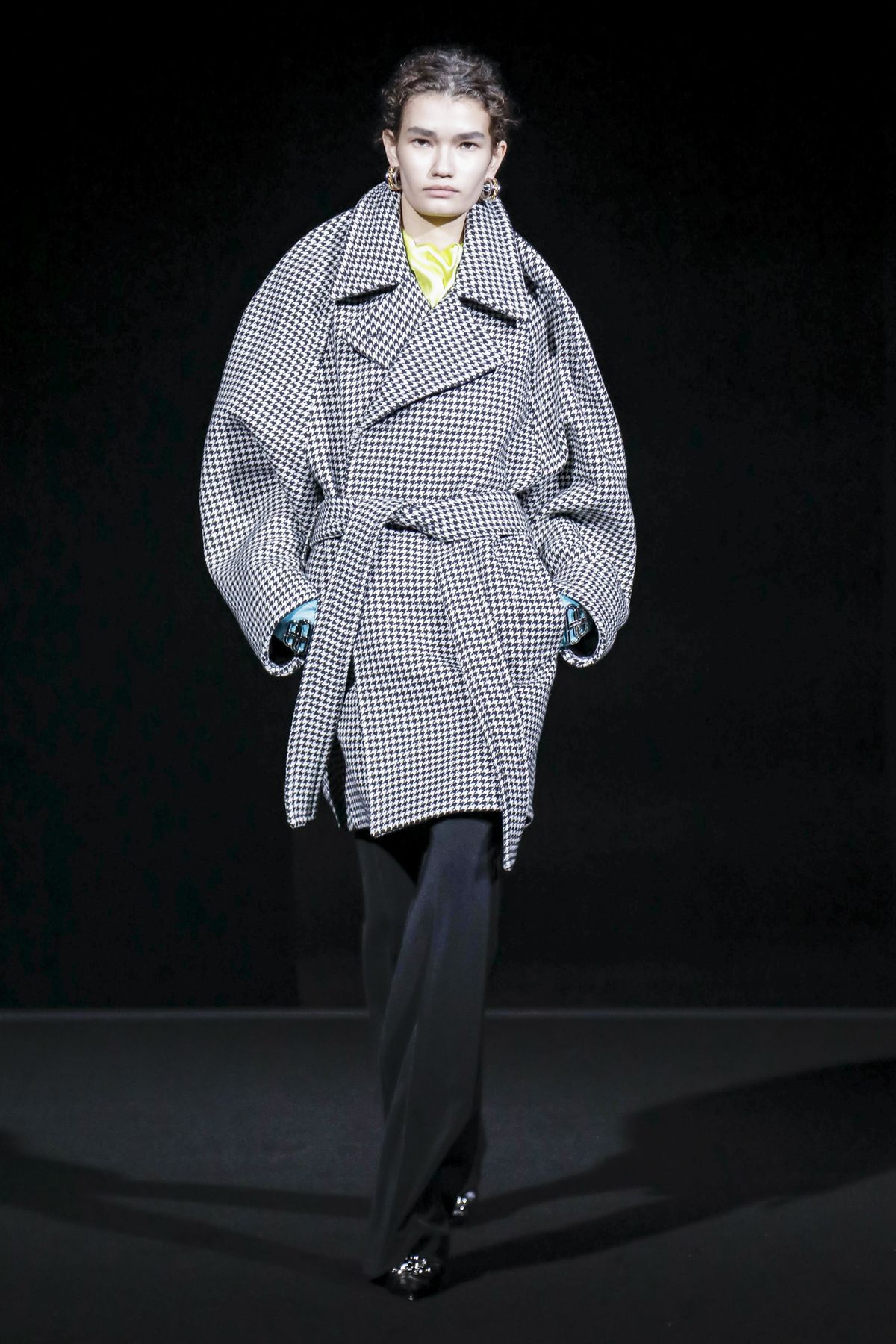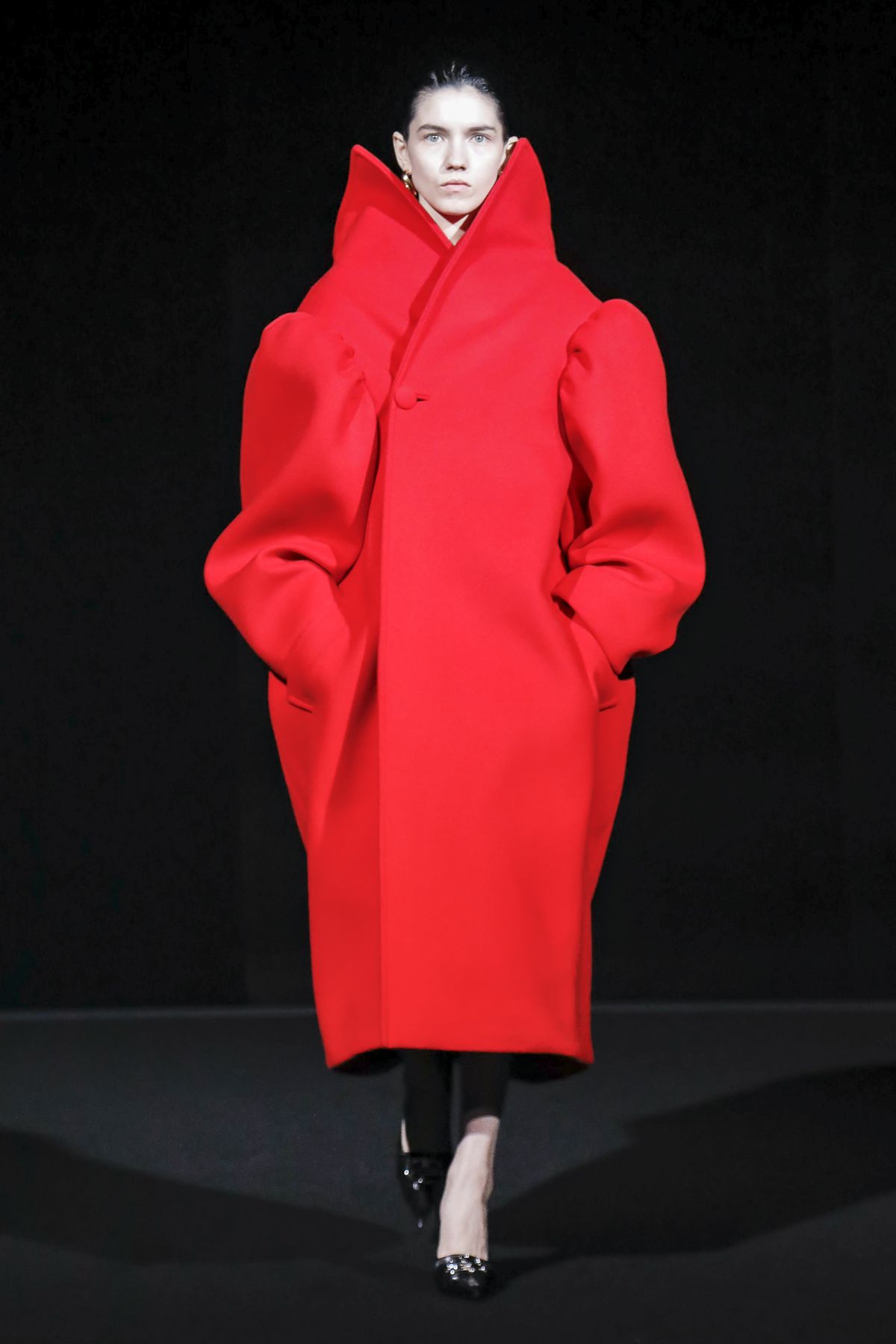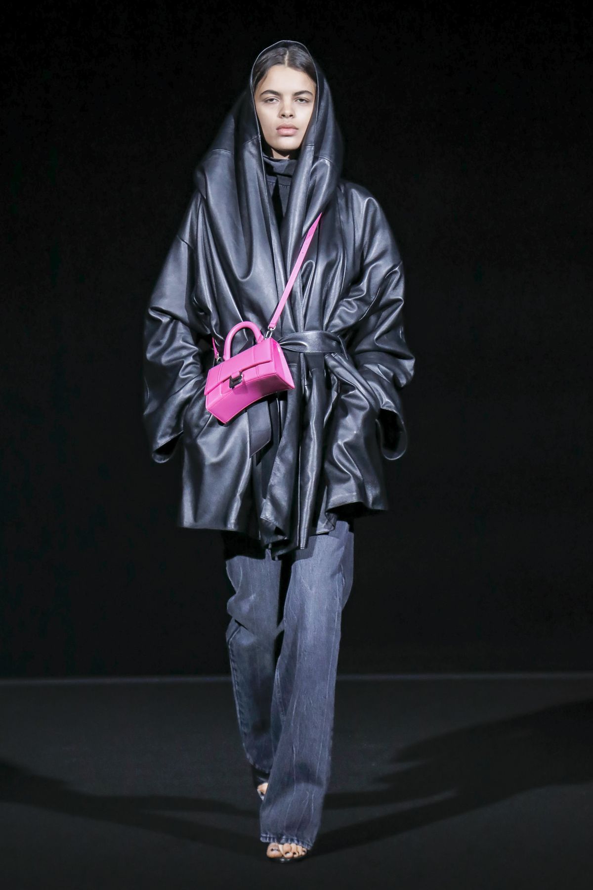 Draining collections of seasonal themes and narratives was one of the big ideas Demna Gvasalia brought to fashion, and to Balenciaga. He gave that the heave-ho for fall, and poured a vast field of fragrant asphalt upon which to parade his vision of “the real Parisian of today.” The stark set and dim, flickering lighting did not obscure the rush of bold, thrilling fashion that whisked past, almost brushing the knees of guests.