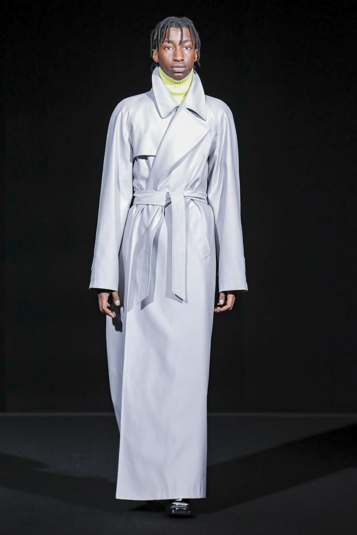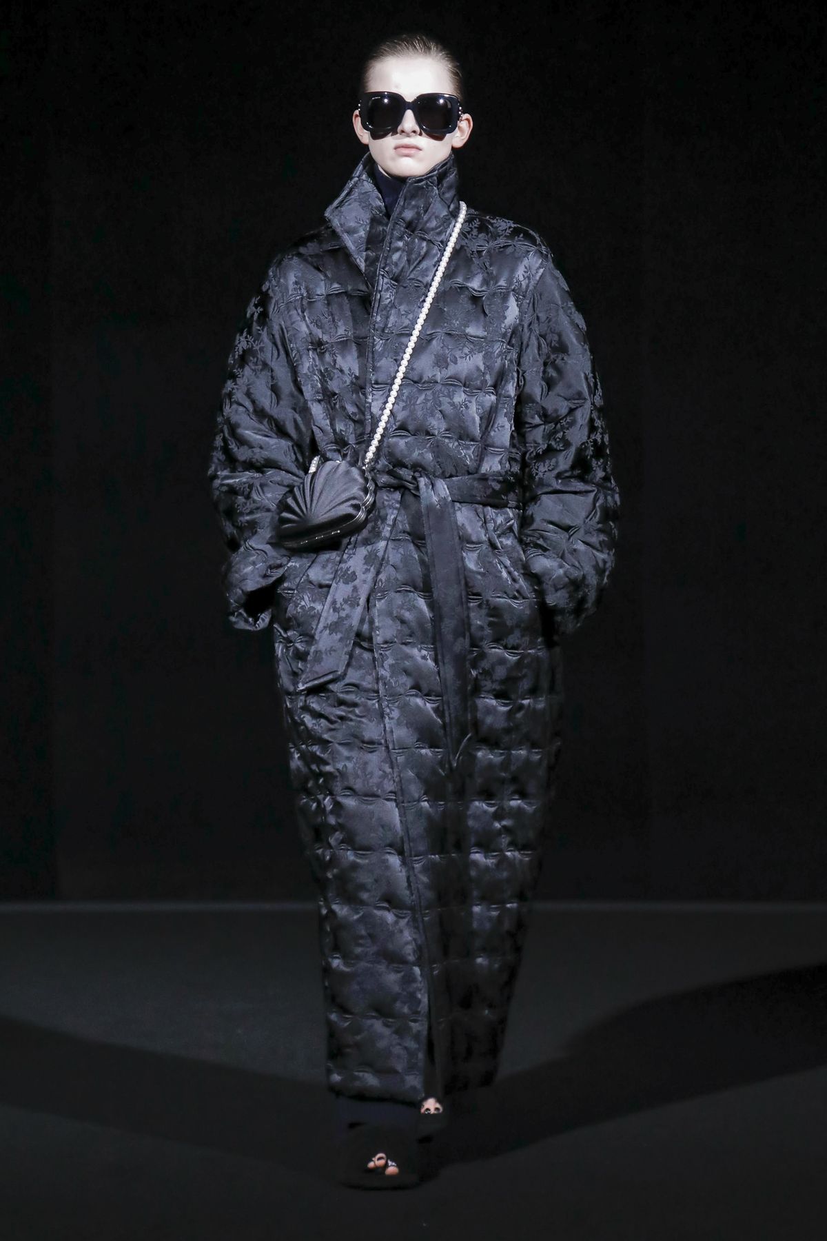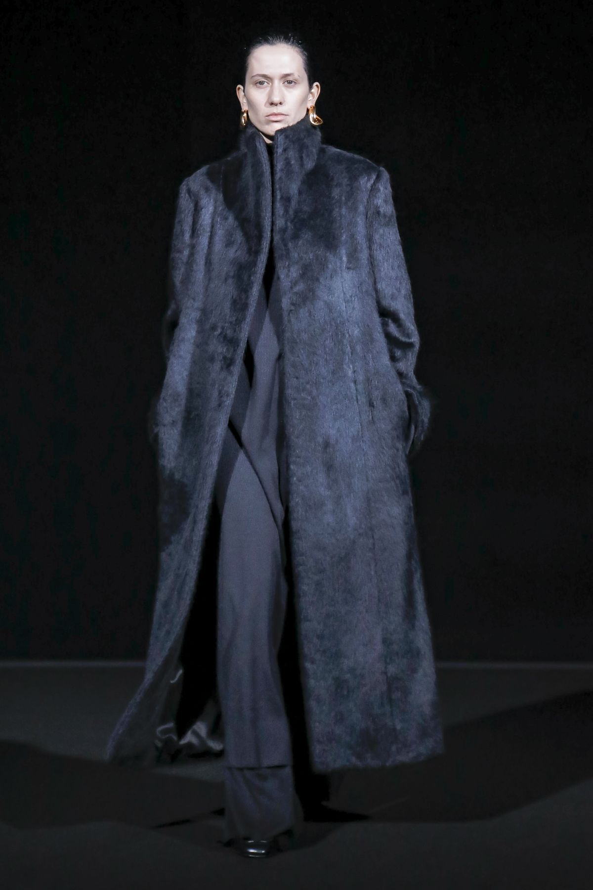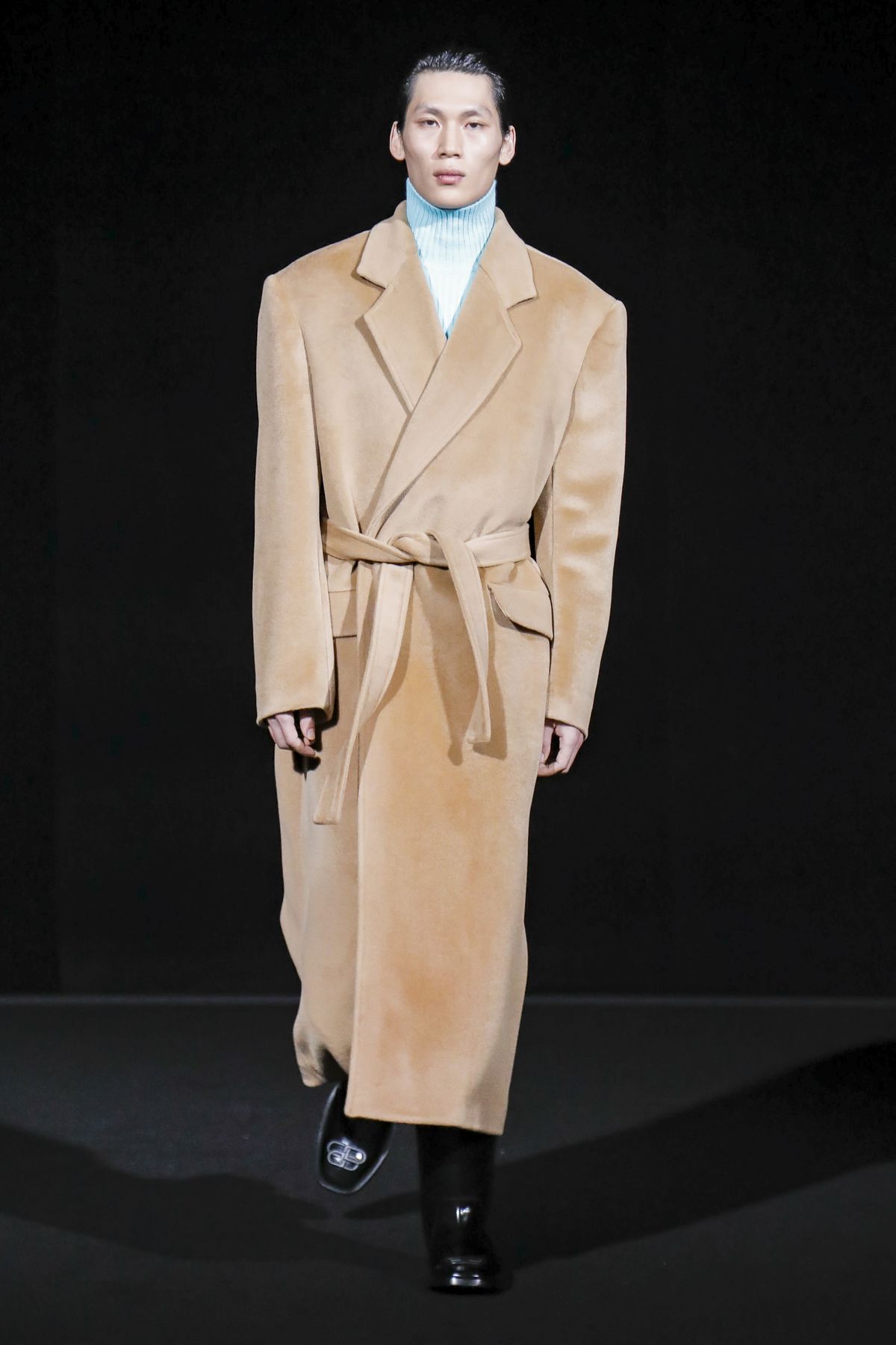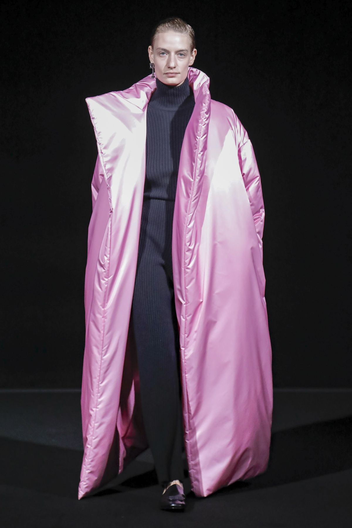 Gvasalia reinforced his claim on oversize shapes, proposing enveloping cocoon puffers, sumptuous kimonos and beefy belted shearlings for her; fridge-size, camel top coats and boxy, gray pea jackets for him. The collection was pared back yet compelling, with most of the volume plays centered on the shoulders. Exaggerated sleeve heads via 3-D molding elaborated on a very Margiela idea, while pitching the yoke and sleeves forward and tacking them along the collarbone looked entirely new, and gave a cool rounded shape, like a penumbra. He applied this to puffers and pea coats for men; and sleek trench coats for women.