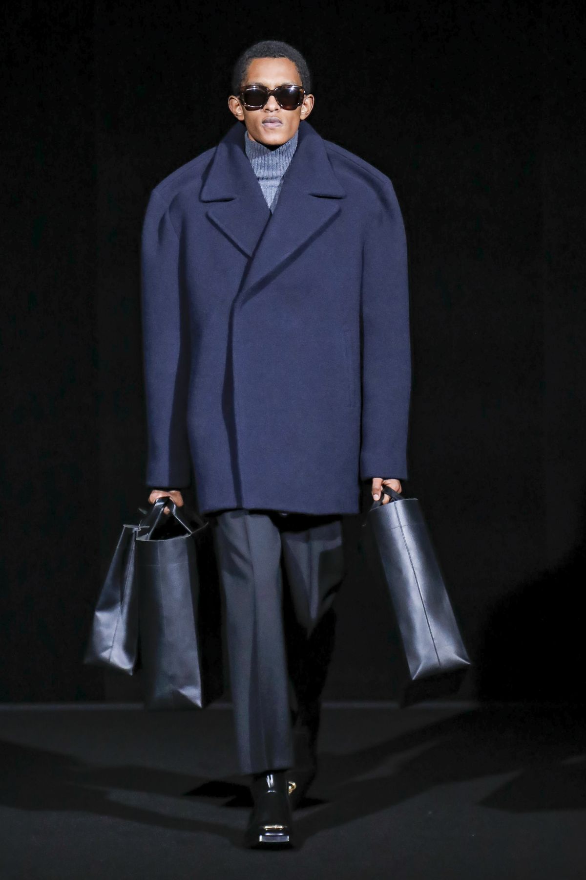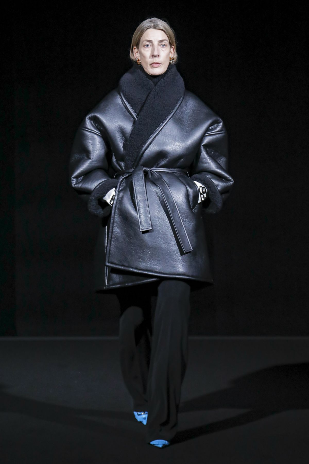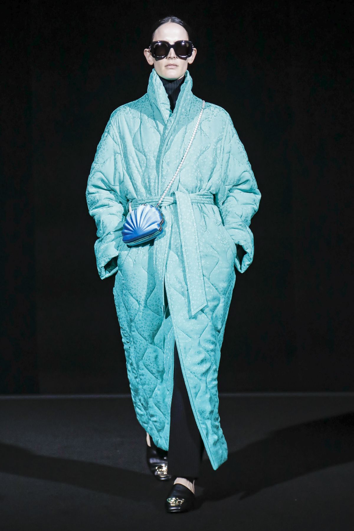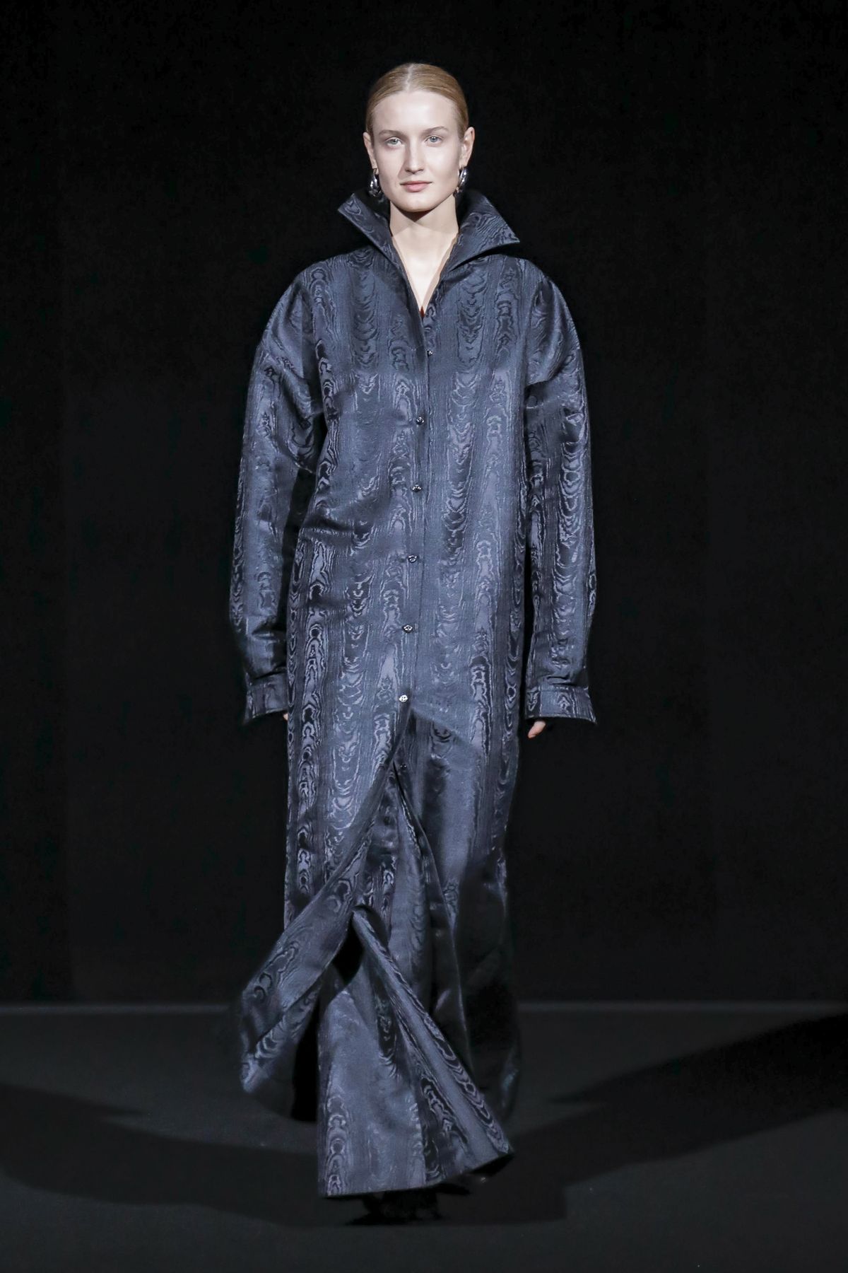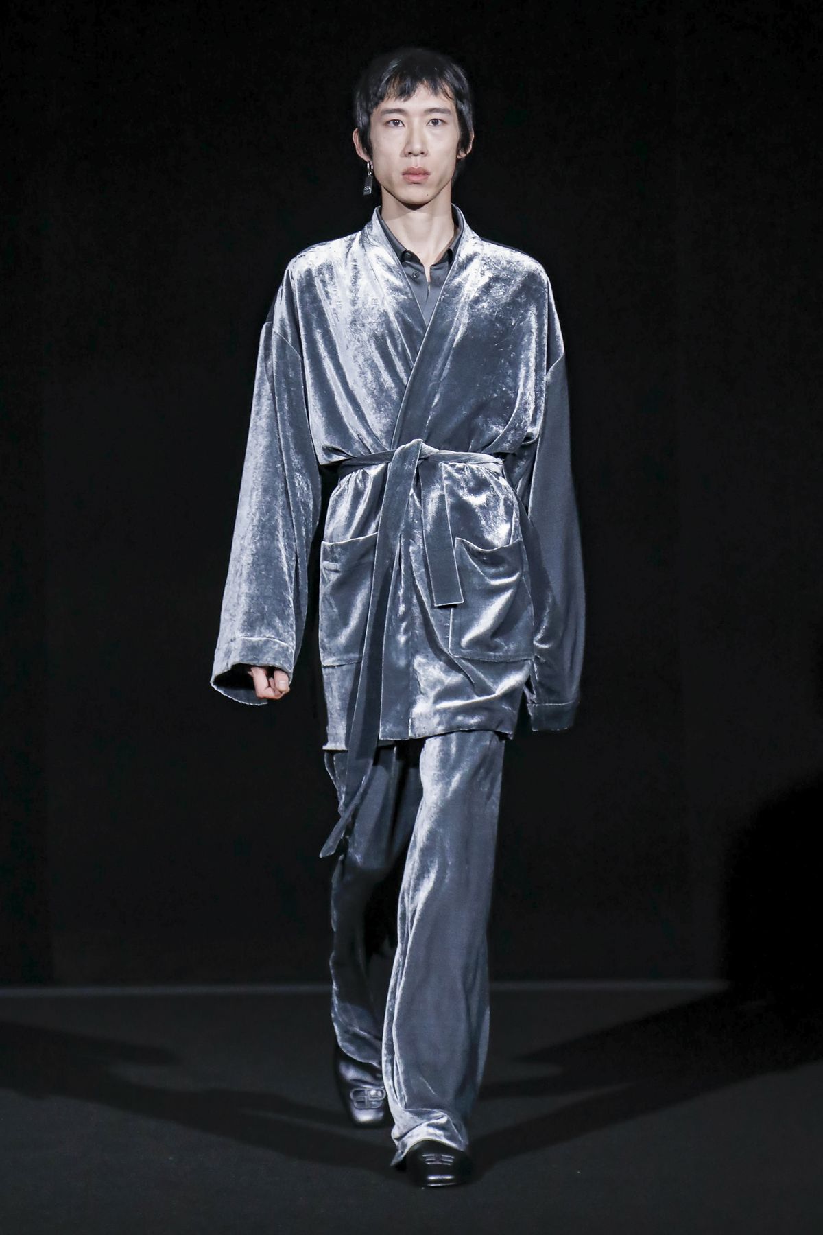 Gvasalia reinforced his claim on oversize shapes, proposing enveloping cocoon puffers, sumptuous kimonos and beefy belted shearlings for her; fridge-size, camel top coats and boxy, gray pea jackets for him. The collection was pared back yet compelling, with most of the volume plays centered on the shoulders. Exaggerated sleeve heads via 3-D molding elaborated on a very Margiela idea, while pitching the yoke and sleeves forward and tacking them along the collarbone looked entirely new, and gave a cool rounded shape, like a penumbra. He applied this to puffers and pea coats for men; and sleek trench coats for women.