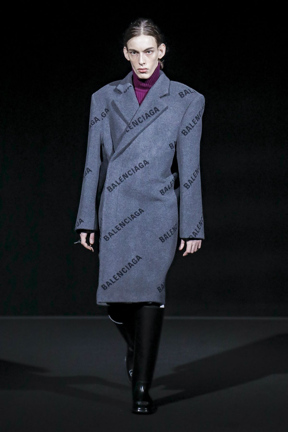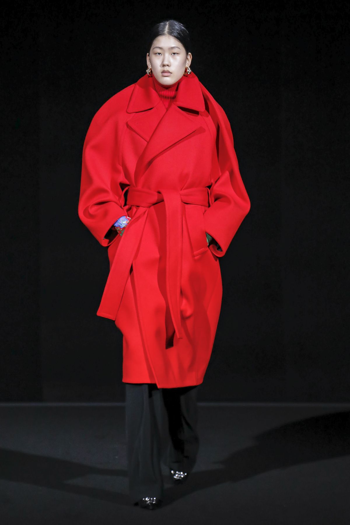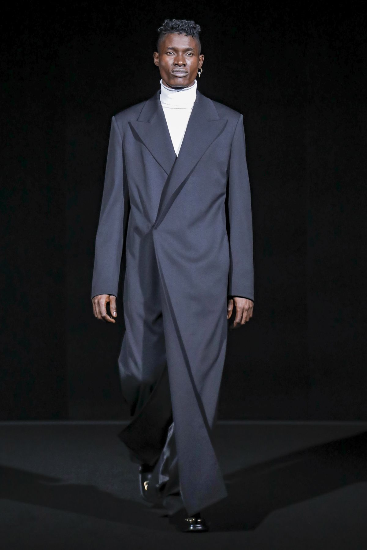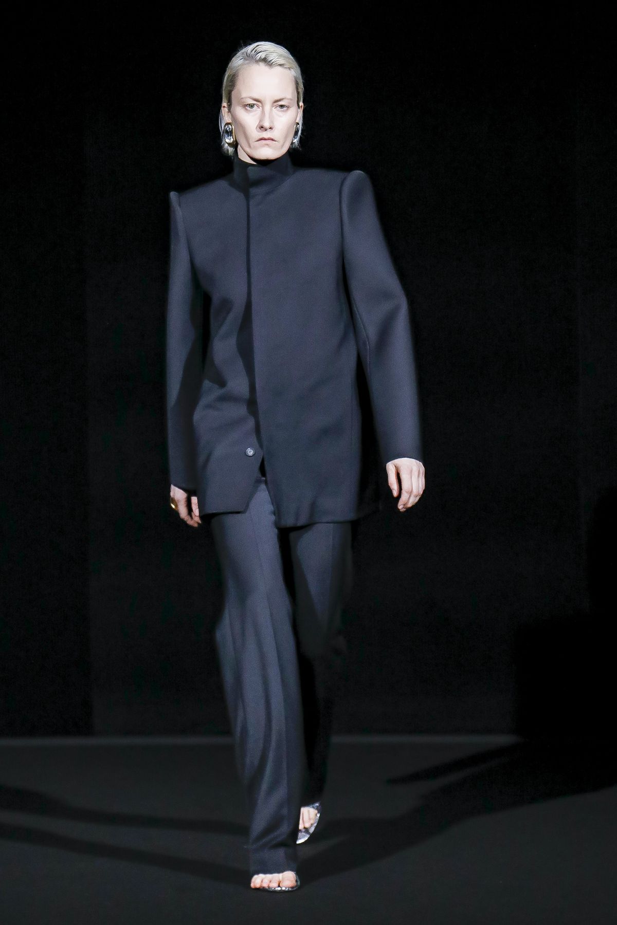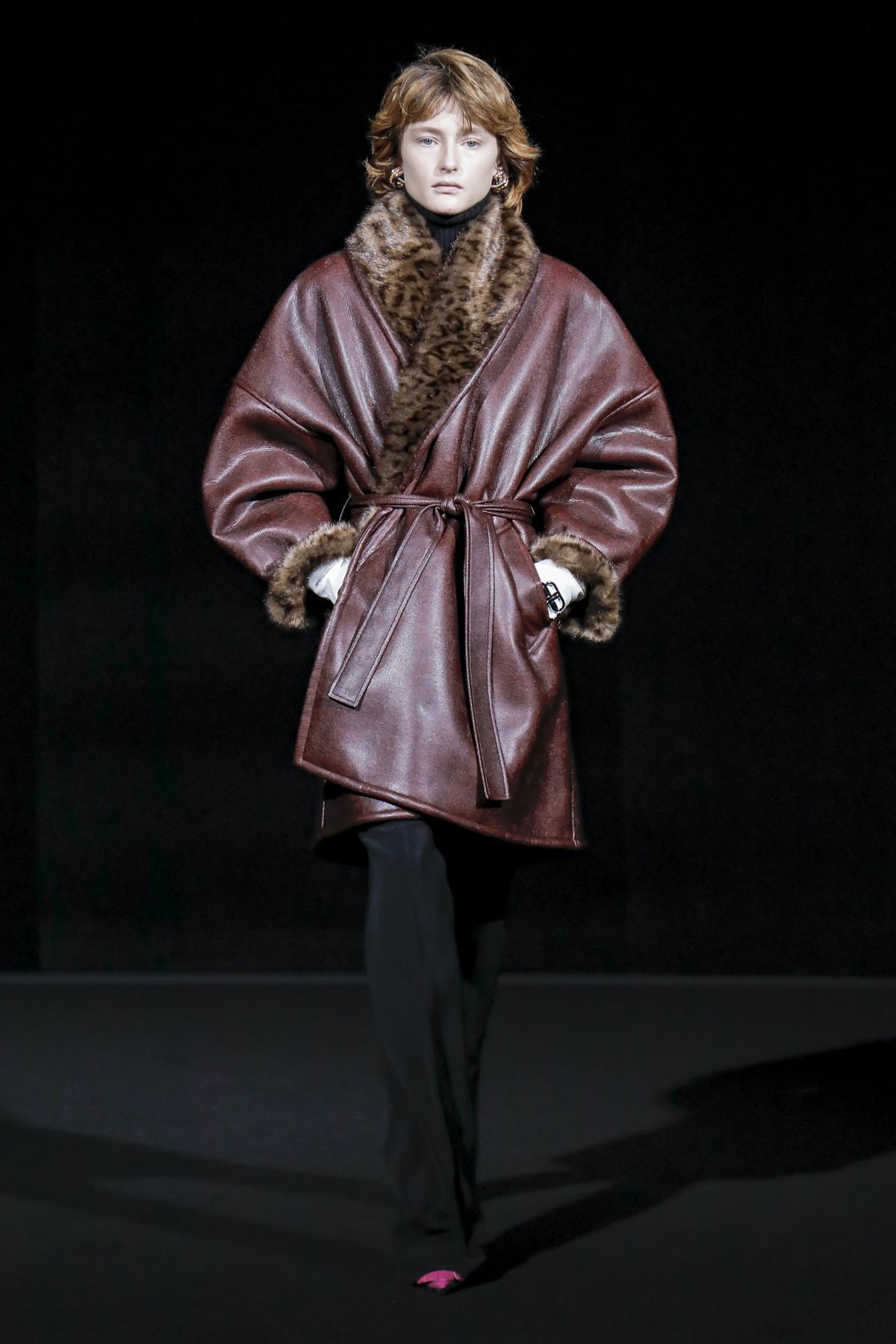 Gvasalia reinforced his claim on oversize shapes, proposing enveloping cocoon puffers, sumptuous kimonos and beefy belted shearlings for her; fridge-size, camel top coats and boxy, gray pea jackets for him. The collection was pared back yet compelling, with most of the volume plays centered on the shoulders. Exaggerated sleeve heads via 3-D molding elaborated on a very Margiela idea, while pitching the yoke and sleeves forward and tacking them along the collarbone looked entirely new, and gave a cool rounded shape, like a penumbra. He applied this to puffers and pea coats for men; and sleek trench coats for women.