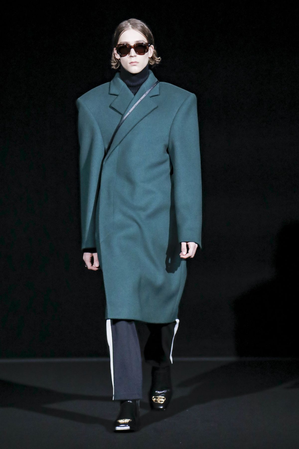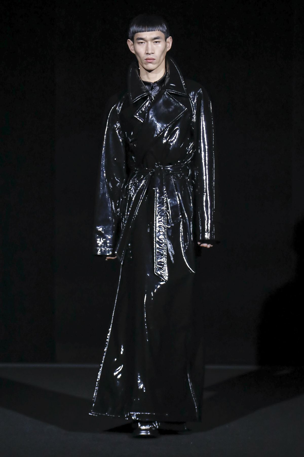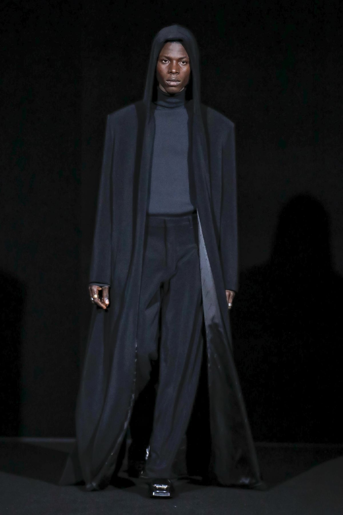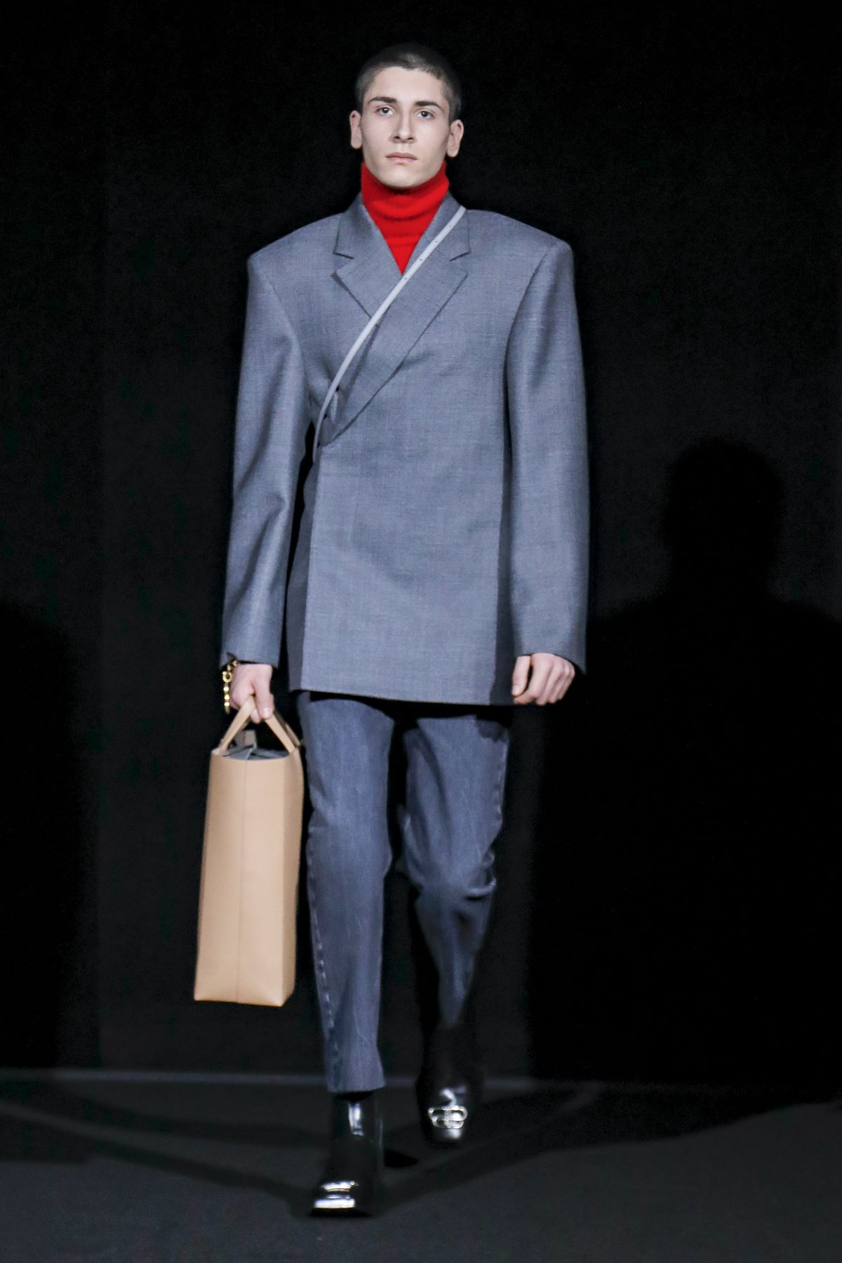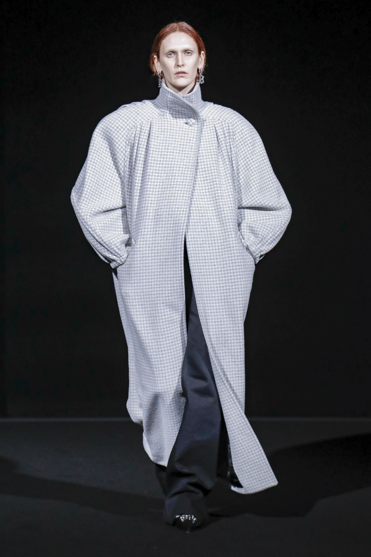 Gvasalia reinforced his claim on oversize shapes, proposing enveloping cocoon puffers, sumptuous kimonos and beefy belted shearlings for her; fridge-size, camel top coats and boxy, gray pea jackets for him. The collection was pared back yet compelling, with most of the volume plays centered on the shoulders. Exaggerated sleeve heads via 3-D molding elaborated on a very Margiela idea, while pitching the yoke and sleeves forward and tacking them along the collarbone looked entirely new, and gave a cool rounded shape, like a penumbra. He applied this to puffers and pea coats for men; and sleek trench coats for women.