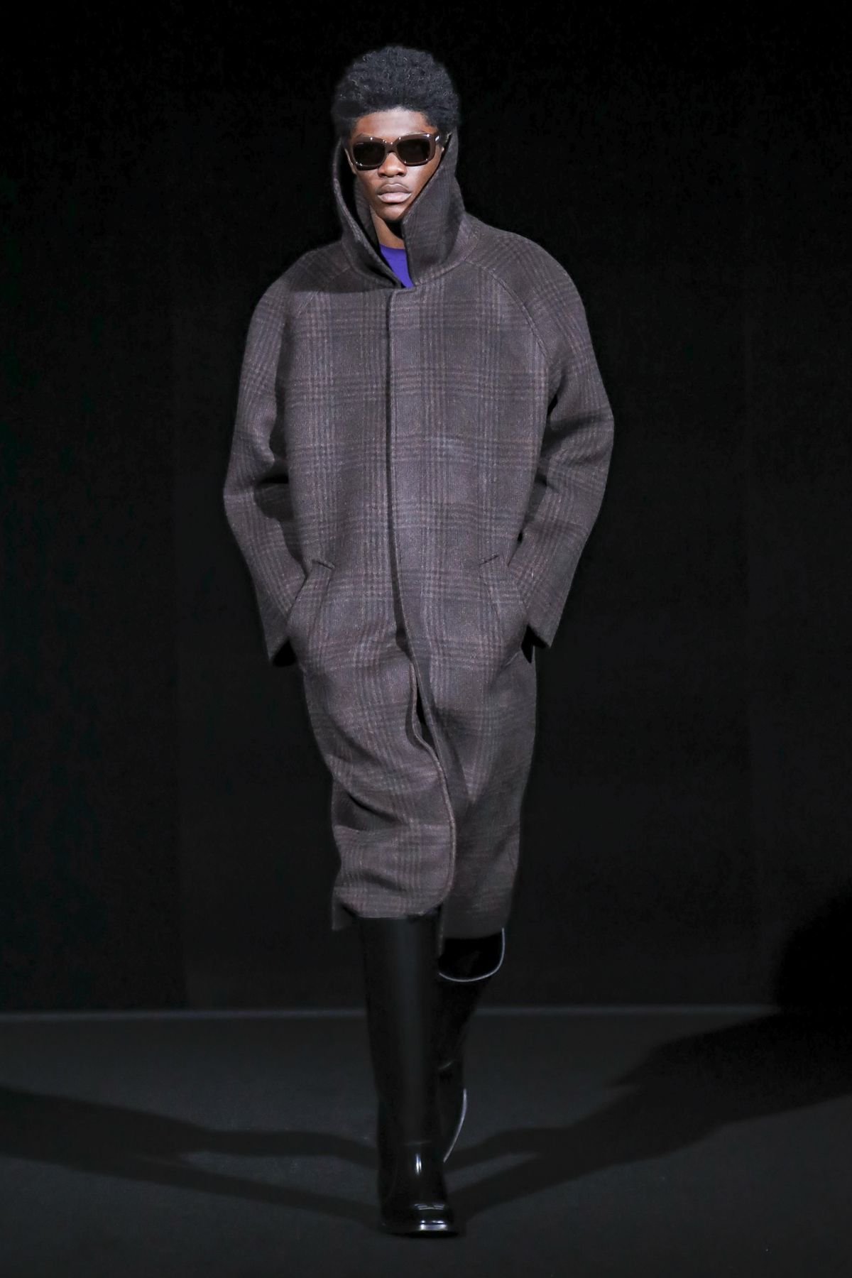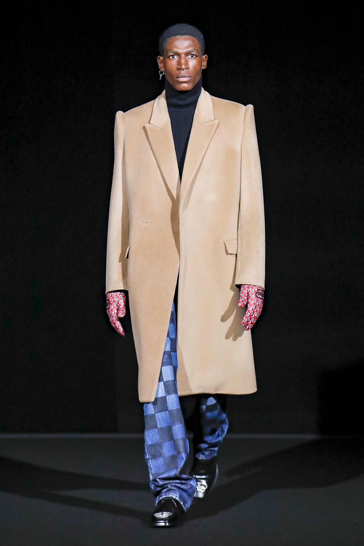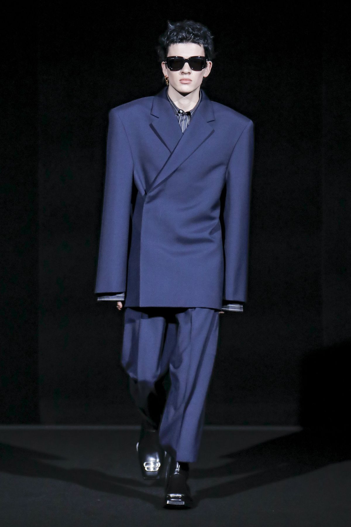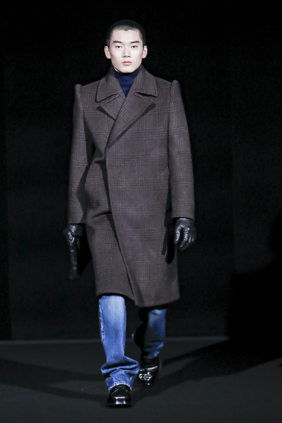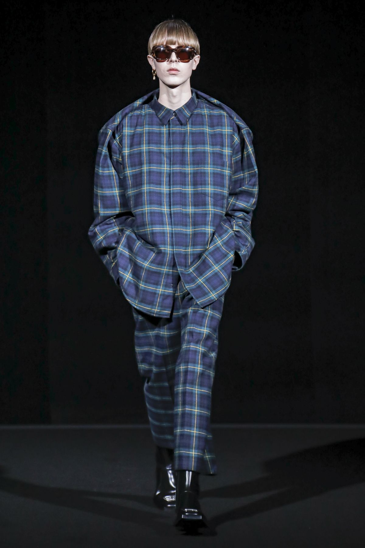 Gvasalia reinforced his claim on oversize shapes, proposing enveloping cocoon puffers, sumptuous kimonos and beefy belted shearlings for her; fridge-size, camel top coats and boxy, gray pea jackets for him. The collection was pared back yet compelling, with most of the volume plays centered on the shoulders. Exaggerated sleeve heads via 3-D molding elaborated on a very Margiela idea, while pitching the yoke and sleeves forward and tacking them along the collarbone looked entirely new, and gave a cool rounded shape, like a penumbra. He applied this to puffers and pea coats for men; and sleek trench coats for women.