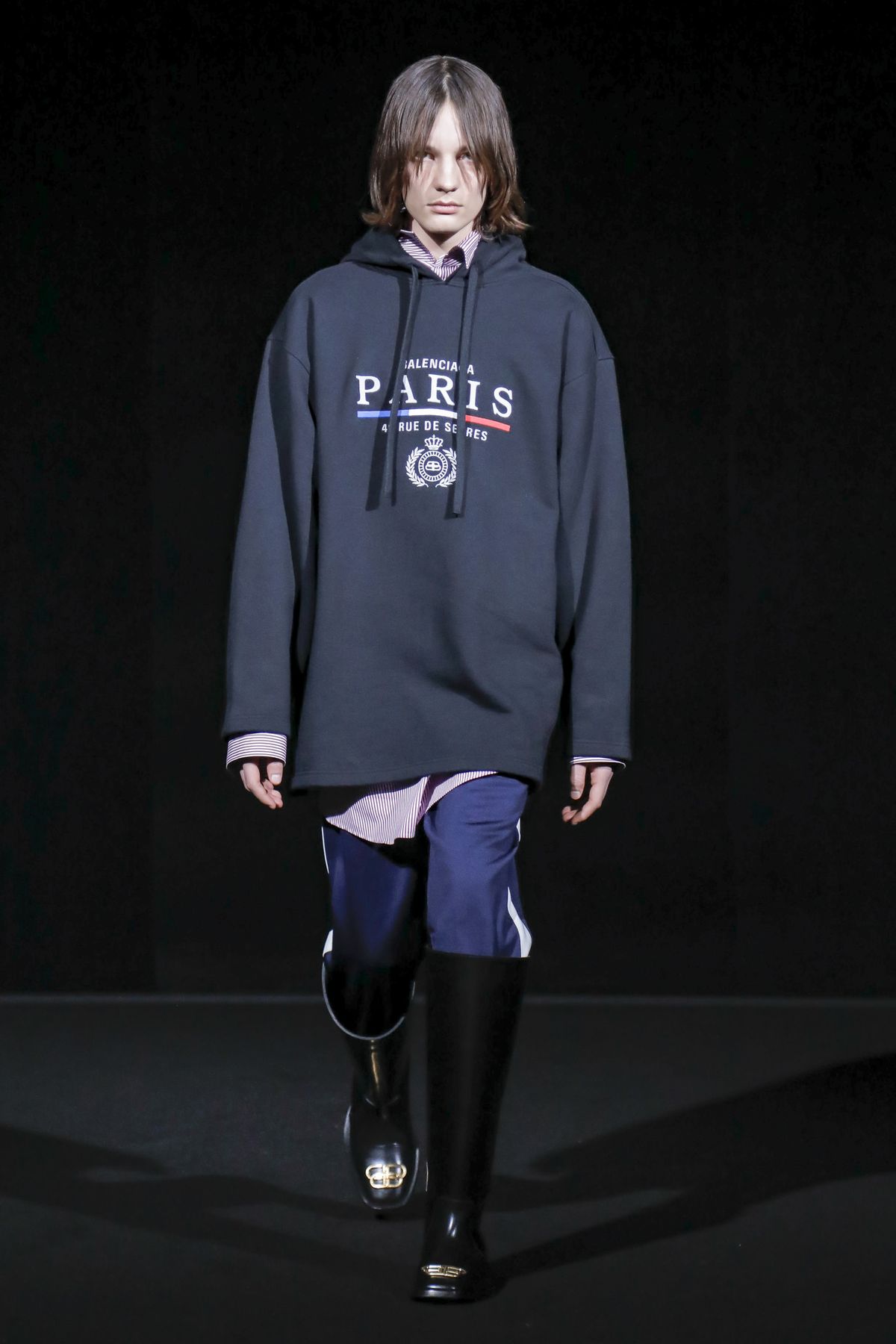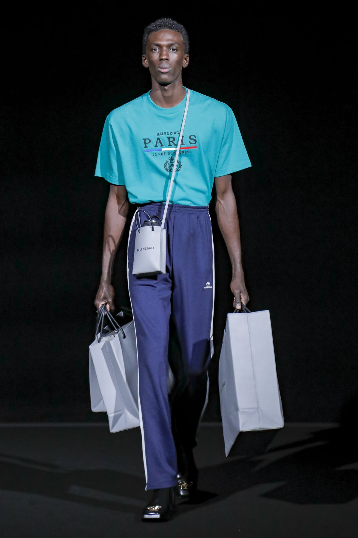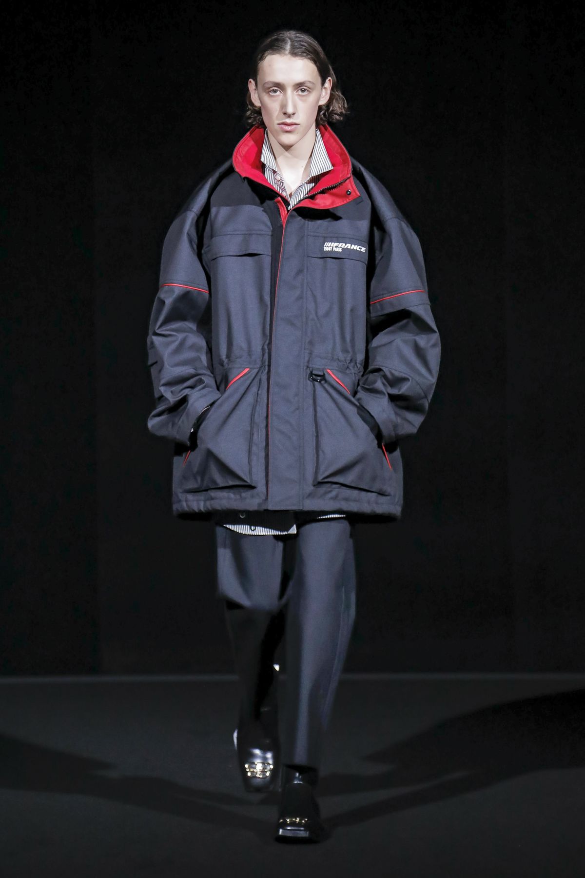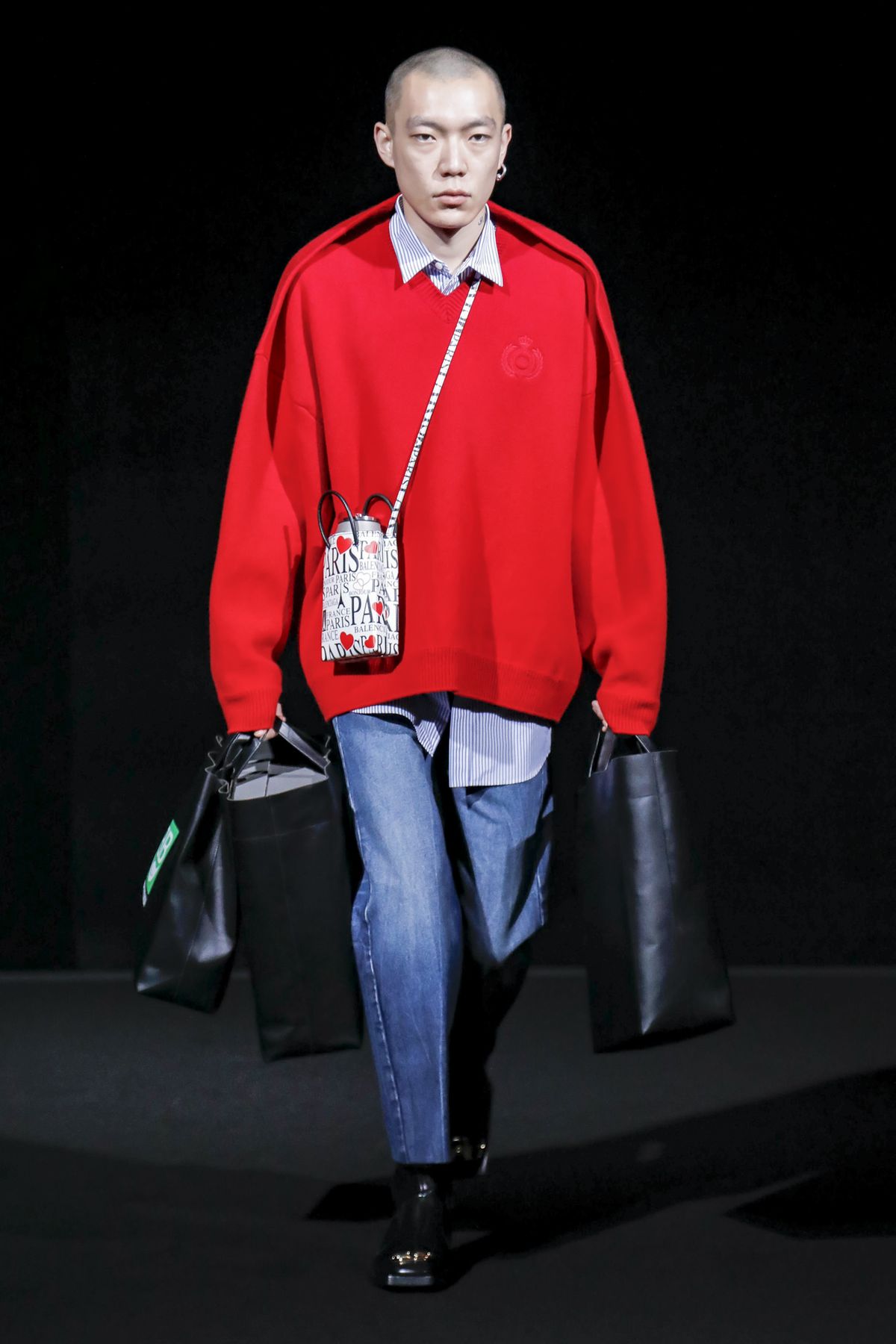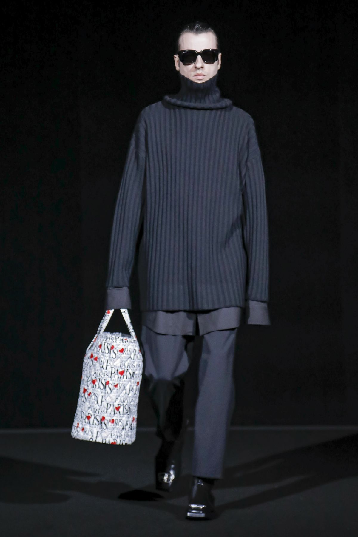 His take was raw, and emitted a hard edge as pungent as the tar smell wafting from the floor. For Gvasalia, Paris is not the mythic fashion city represented in arch couture photos of the Fifties and Sixties, but a buzzing metropolis, with helpings of grit and fierceness. “Patterns and shapes emblemize common daily activities — grocery shopping, commuting via motorbike, and going out after work,” the show notes dryly enumerated.