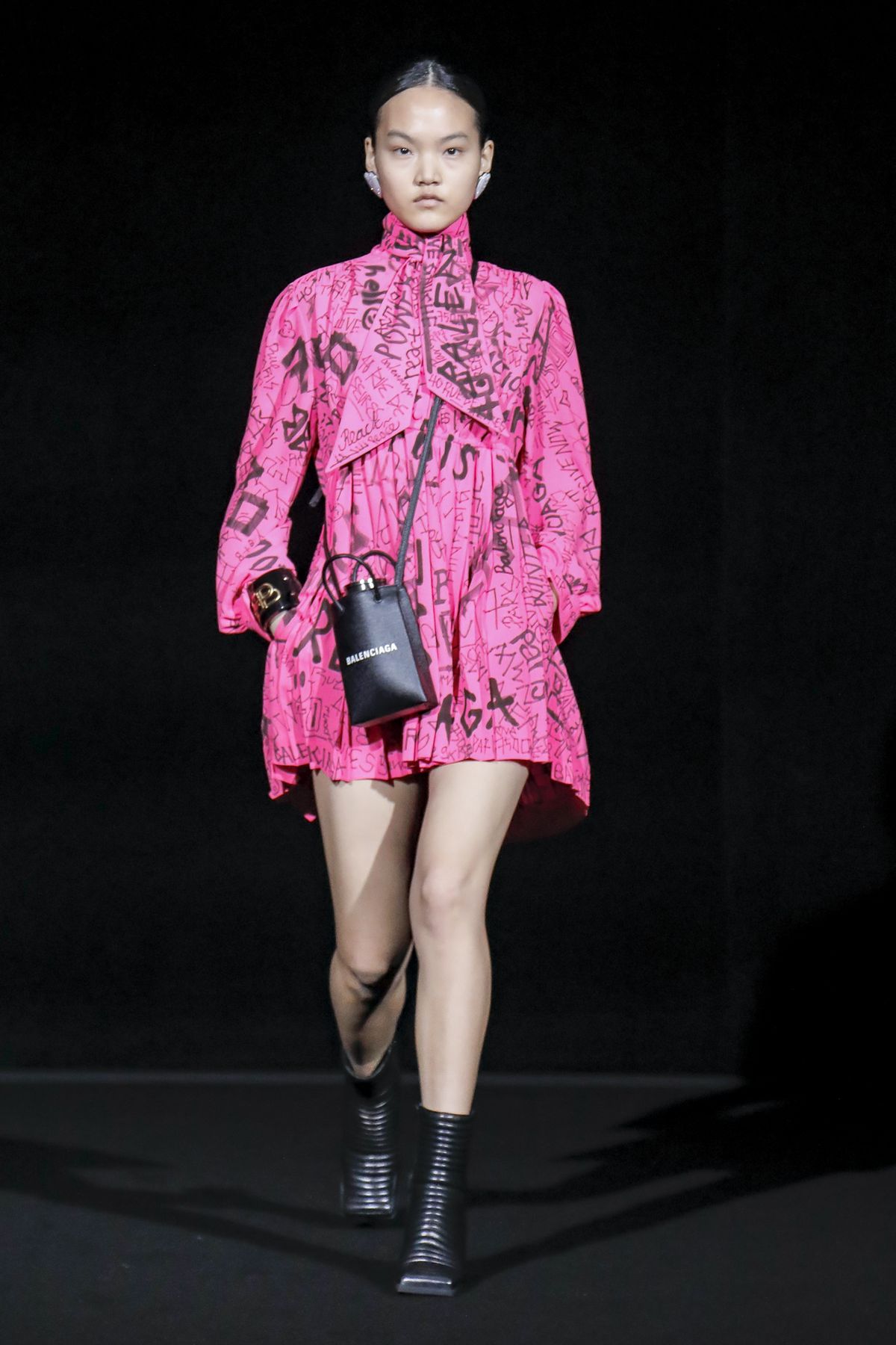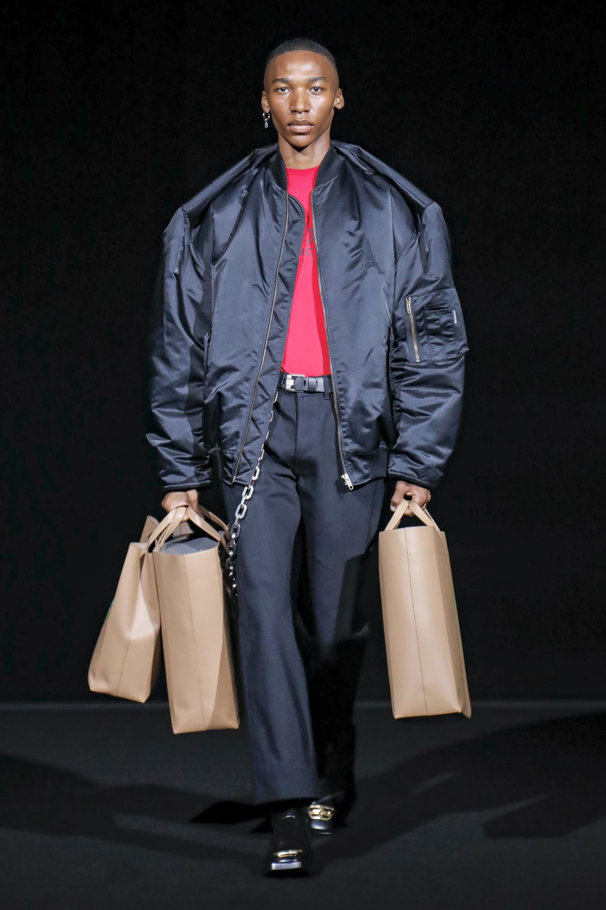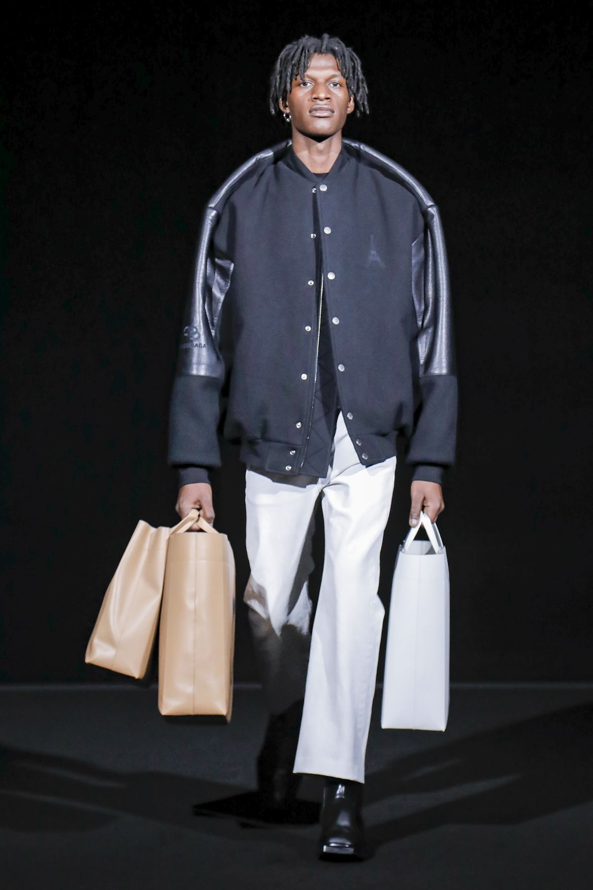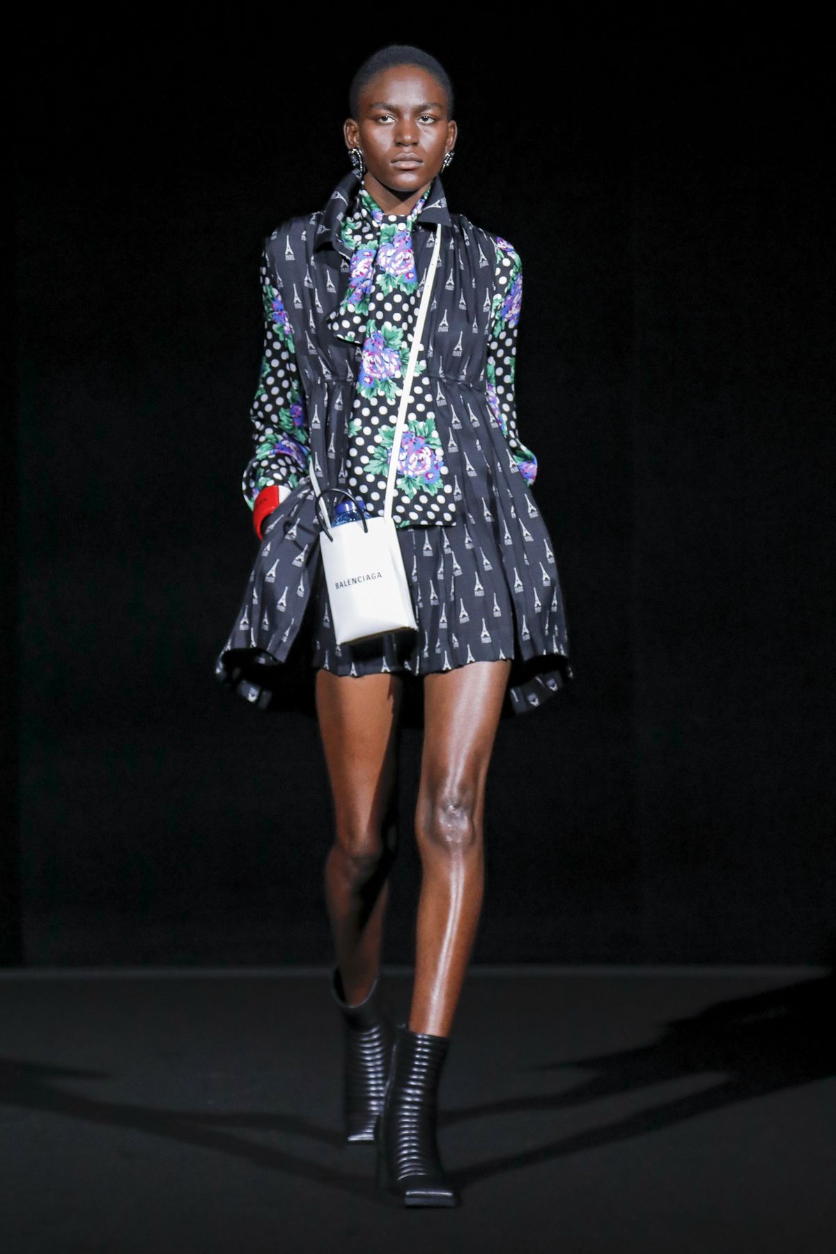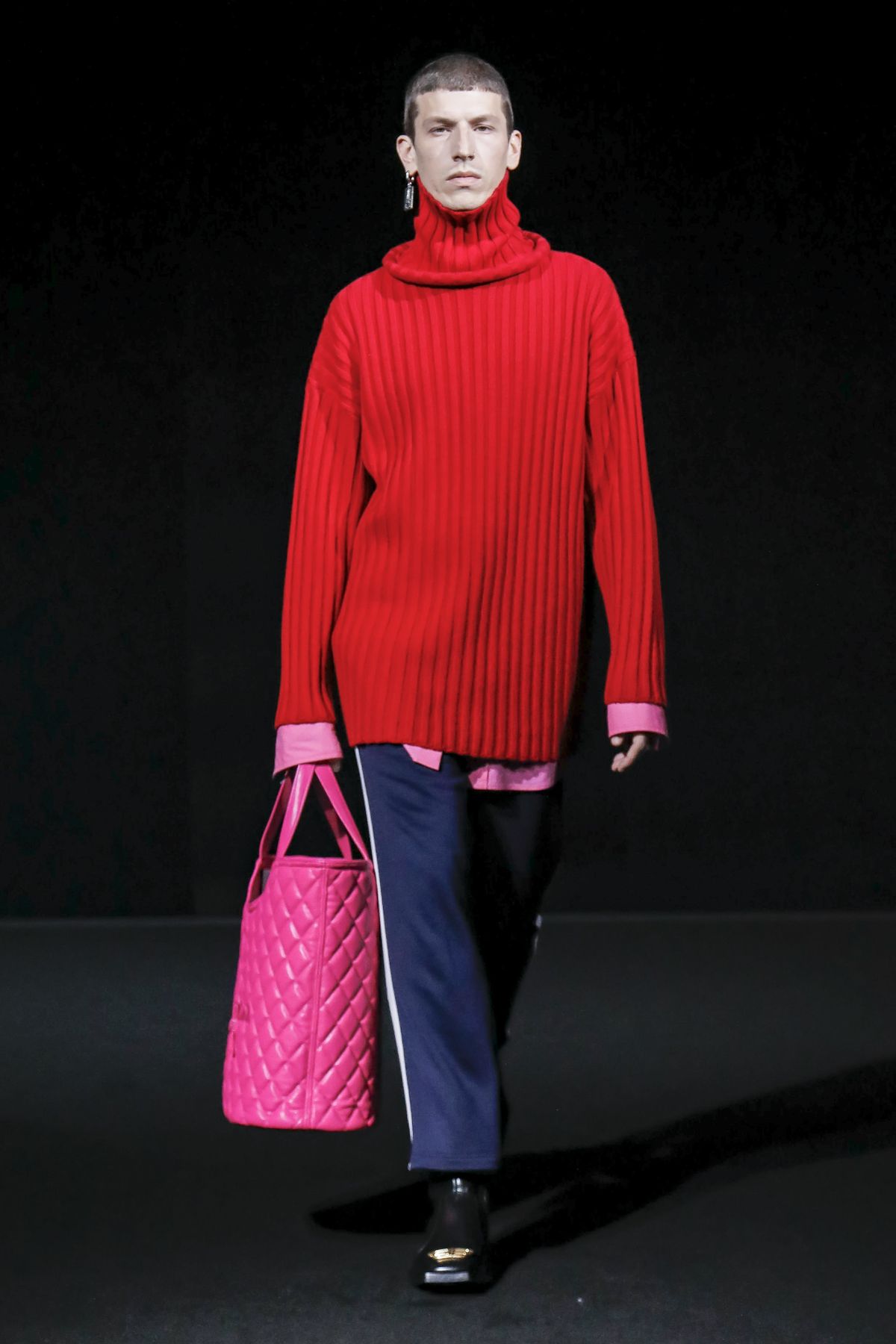 His take was raw, and emitted a hard edge as pungent as the tar smell wafting from the floor. For Gvasalia, Paris is not the mythic fashion city represented in arch couture photos of the Fifties and Sixties, but a buzzing metropolis, with helpings of grit and fierceness. “Patterns and shapes emblemize common daily activities — grocery shopping, commuting via motorbike, and going out after work,” the show notes dryly enumerated.